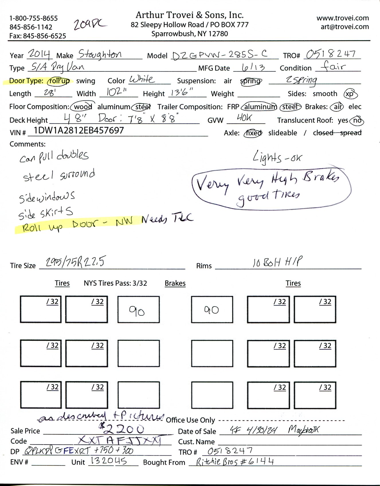 Inventory # 0518247Year: 2014 Make: Stoughton Model: DZGPVW-285S-C Axles: Fixed Single Type: Dry Box Trailer VIN: 1DW1A2812EB457697 Suspension: 2 Spring Tires: 295/75R22.5 Rims: 10 Bolt Hub Pilot - Steel Length: 28' Width: 102" Height: 13'6" Weight (Approximate): 8,540 lb GVW: 40,000 lb Floor Composition: Wood / Steel Trailer Composition: Steel / Aluminum Door Type: Roll Up - Steel Surround (Not Working) Door Opening Width: 7'8" Door Opening Height: 8'8" Added Details: Air Brakes, Can Pull Doubles, Aluminum Roof, Side Windows, Side Skirts Price: $2,200 209DCXXTAFJJXXTQPLKDPGFEXRT+750+300 Terms of Sale