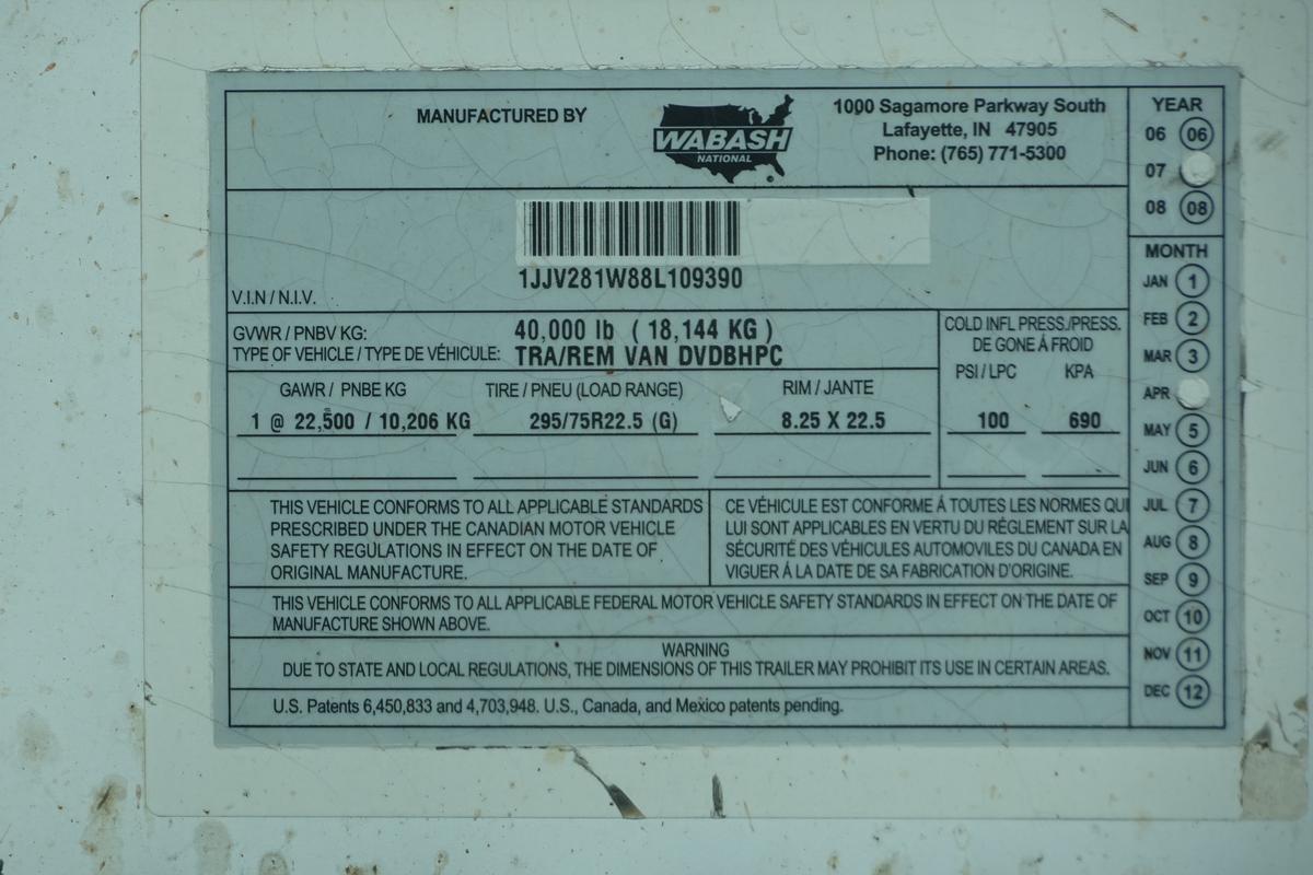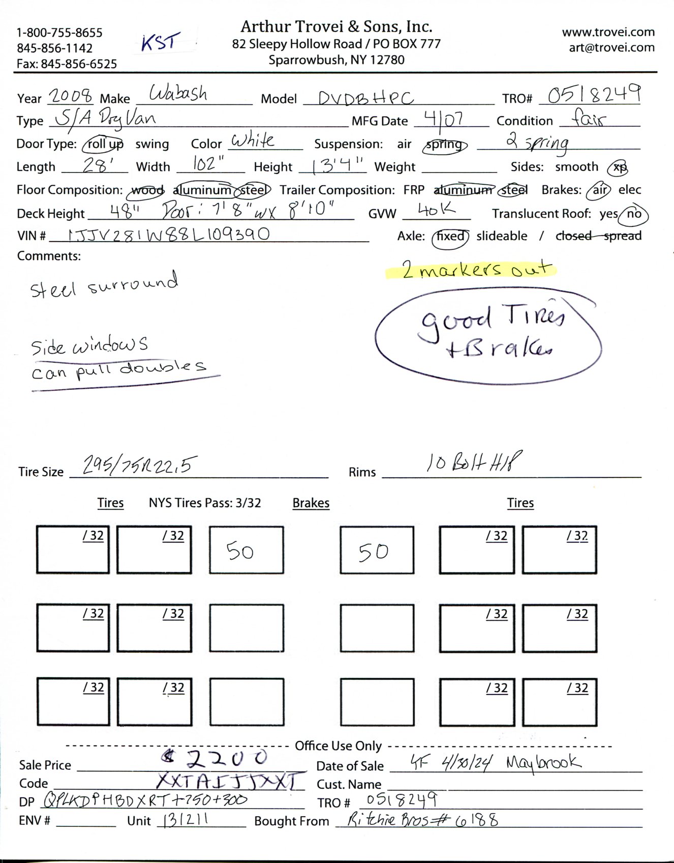 Inventory # 0518249Year: 2008 Make: Wabash Model: DVDBHPC Axles: Fixed single Type: Dry box trailer VIN: 1JJV281W88L109390 Suspension: 2 Spring Tires: 275/80R22.5 / 295/75R22.5 Rims: 10 Bolt Hub Pilot - Steel Length: 28' Width: 102" Height: 13'4" Weight (Estimated): 8,760 lb GVW: 40,000 lb Floor Composition: Wood / Steel / Aluminum Trailer Composition: Steel / Aluminum Door Type: Roll Up - Steel Surround Door Opening Width: 7'8" Door Opening Height: 8'10" Added Details: Air Brakes, Side Windows, Can Pull Doubles, Aluminum Roof, Vertical Logistics, Some Aluminum Crossmembers Price: $2,200 KSTXXTAIJJXXTQRTVDPHBDXRT+750+300 Terms of Sale