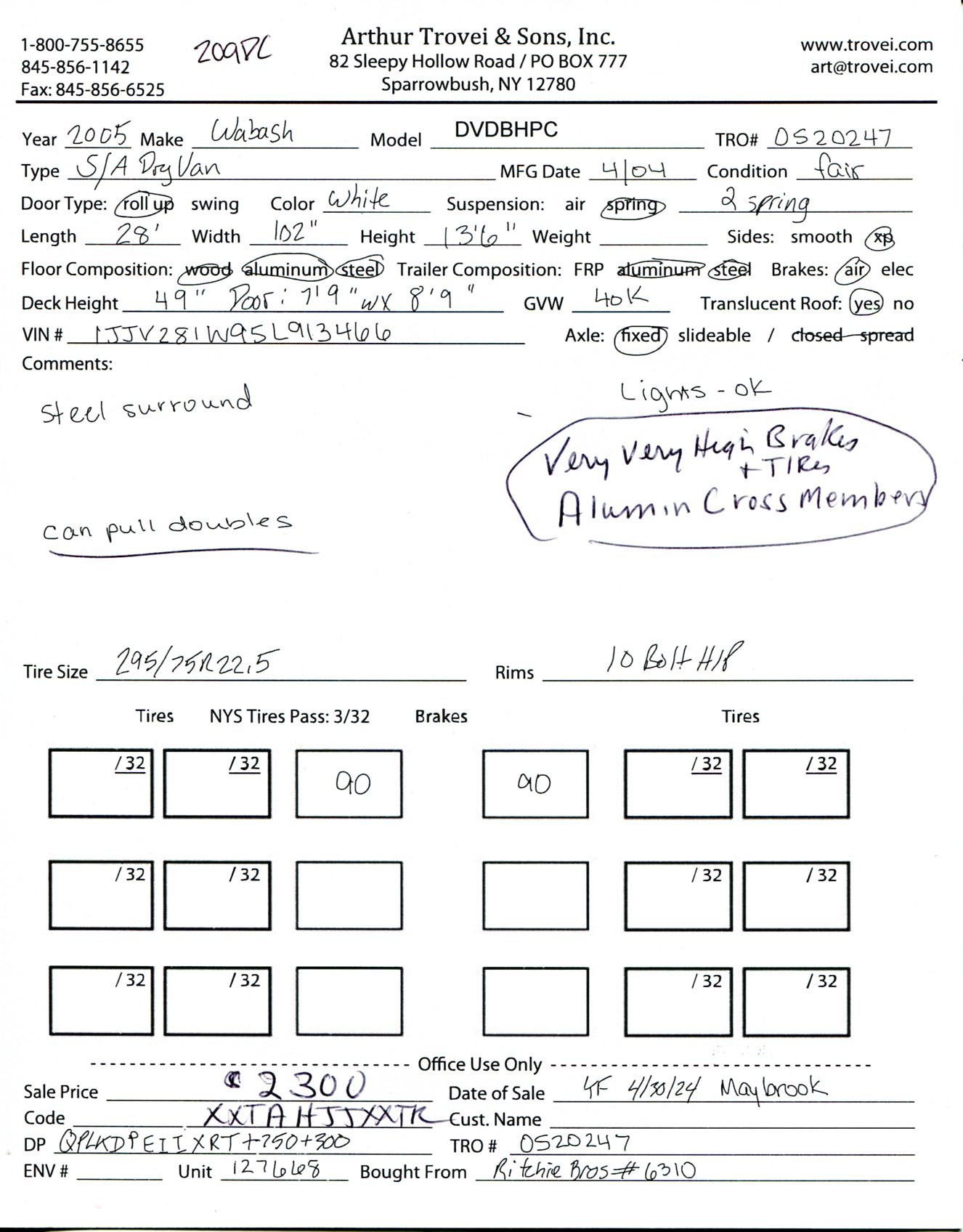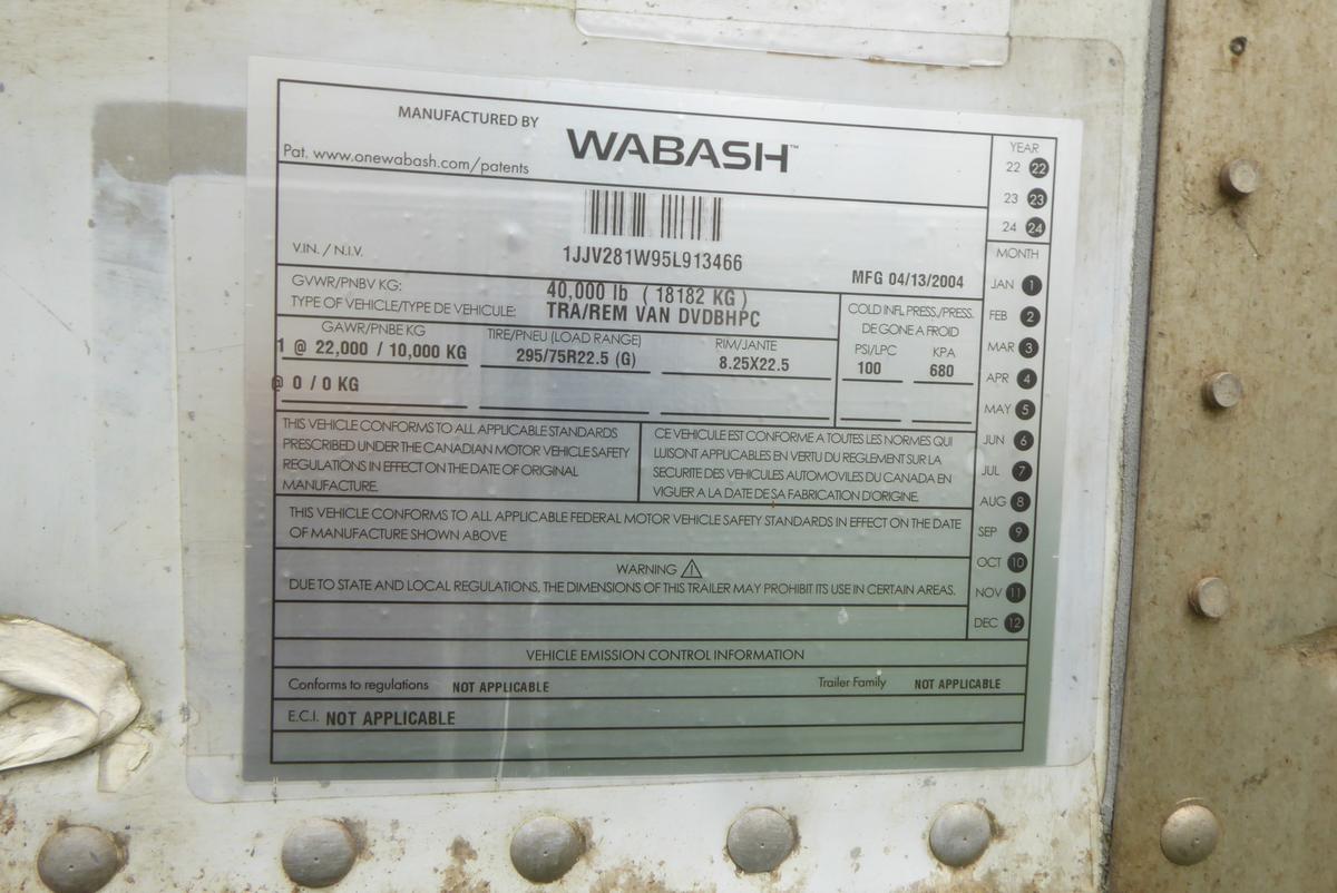 Inventory # 0520247Year: 2005 Make: Wabash Model: DVDBHPC Axles: Fixed Single Type: Dry Box Trailer VIN: 1JJV281W95L913466 Suspension: 2 Spring Tires: 275/80R22.5 / 295/75R22.5 Rims: 10 Bolt Hub Pilot - Steel Length: 28' Width: 102" Height: 13'6" Weight (Estimated): 9,040 lbs GVW: 40,000 lbs Floor Composition: Wood / Steel / Aluminum Trailer Composition: Steel / Aluminum Door Type: Roll Up - Steel Surround Door Opening Width: 7'9" Door Opening Height: 8'9" Added Details: Air Brakes, Can Pull Doubles, Translucent Roof, Vertical Logistics Price: $2,300 209DCXXTAHJJXXTQRTVDPEIIXRT+750+300 Terms of Sale