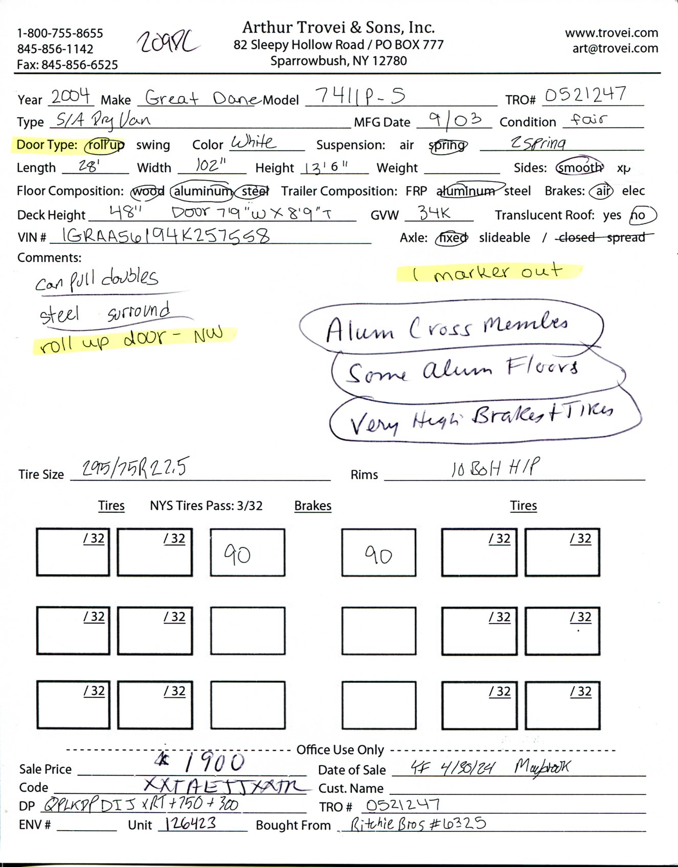 Inventory # 0521247Year: 2004 Make: Great Dane Model: 7411P-S Axles: Fixed Single Type: Dry Box Trailer VIN: 1GRAA56194K257558 Suspension: 2 Spring Tires: 275/80R22.5 / 295/75R22.5 Rims: 10 Bolt Hub Pilot - Steel Length: 28' Width: 102" Height: 13'6" Weight (Estimated): 8,920 lb GVW: 34,000 lb Floor Composition: Wood / Steel / Aluminum Trailer Composition: Aluminum Door Type: Roll Up - Steel Surround (Not Working) Door Opening Width: 7'9" Door Opening Height: 8'9" Added Details: Air Brakes, Can Pull Doubles, Aluminum Roof, Vertical Logistics, Some Aluminum Crossmembers Price: $1,900 209DCXXTAEJJXXTQRTVDPDIJXRT+750+300 Terms of Sale