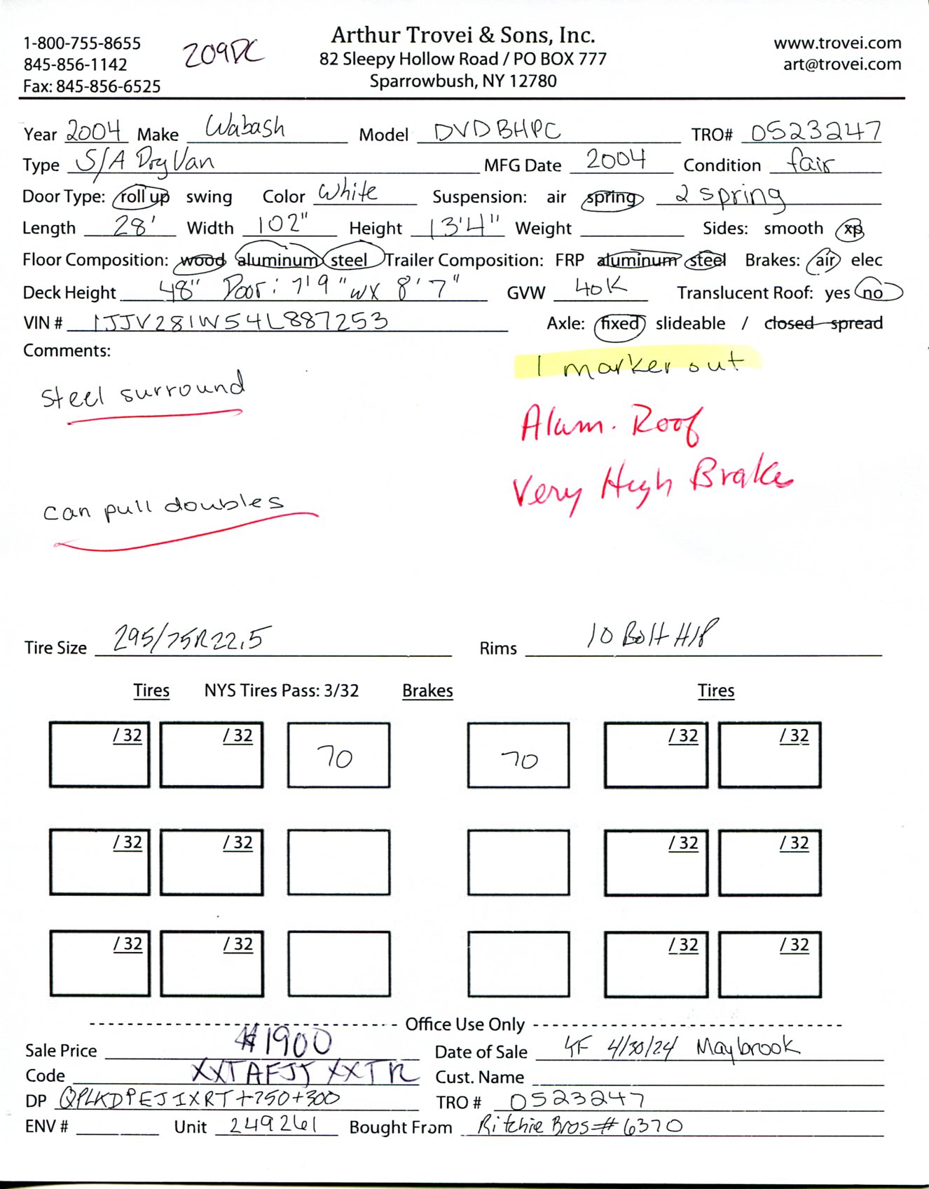 Inventory # 0523247Year: 2004 Make: Wabash Model: DVDBHPC Axles: Fixed Single Type: Dry Box Trailer VIN: 1JJV281W54L887253 Suspension: 2 Spring Tires: 275/80R22.5 / 295/75R22.5 Rims: 10 Bolt Hub Pilot - Steel Length: 28' Width: 102" Height: 13'4" Weight (Estimated): 8,920 lb GVW: 40,000 lb Floor Composition: Wood / Steel / Aluminum Trailer Composition: Aluminum / Steel Door Type: Roll Up - Steel Surround Door Opening Width: 7'9" Door Opening Height: 8'7" Added Details: Air Brakes, Can Pull Doubles, Aluminum Roof, Vertical Logistics, Some Aluminum Crossmembers Price: $1,900 209DCXXTAFJJXXTQRTVDPEJIXRT+750+300 Terms of Sale