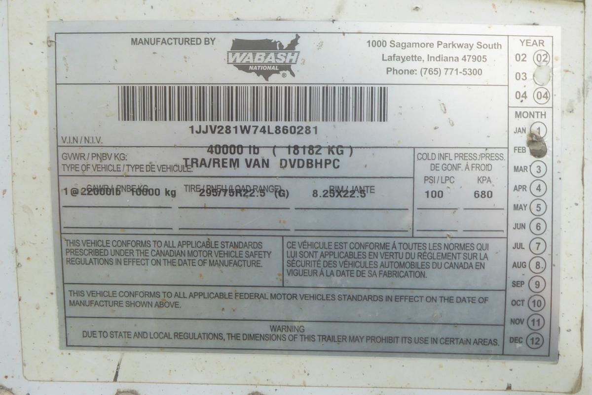 Inventory # 0523248Year: 2004 Make: Wabash Model: DVDBHPC Axles: Fixed Single Type: Dry Box Trailer VIN: 1JJV281W74L860281 Suspension: 2 Spring Tires: 275/80R22.5 / 295/75R22.5 Rims: 10 Bolt Hub Pilot - Steel Length: 28' Width: 102" Height: 13'4" Weight (Estimated): 8,920 lb GVW: 40,000 lb Floor Composition: Wood / Steel Trailer Composition: Aluminum / Steel Door Type: Roll Up - Steel Surround Door Opening Width: 7'9" Door Opening Height: 8'7" Added Details: Air Brakes, Can Pull Doubles, Translucent Roof, Vertical Logistics, Some Aluminum Crossmembers Price: $1,900 209DCXXTAFJJXXTQRTVDPEFEXRT+750+300 Terms of Sale