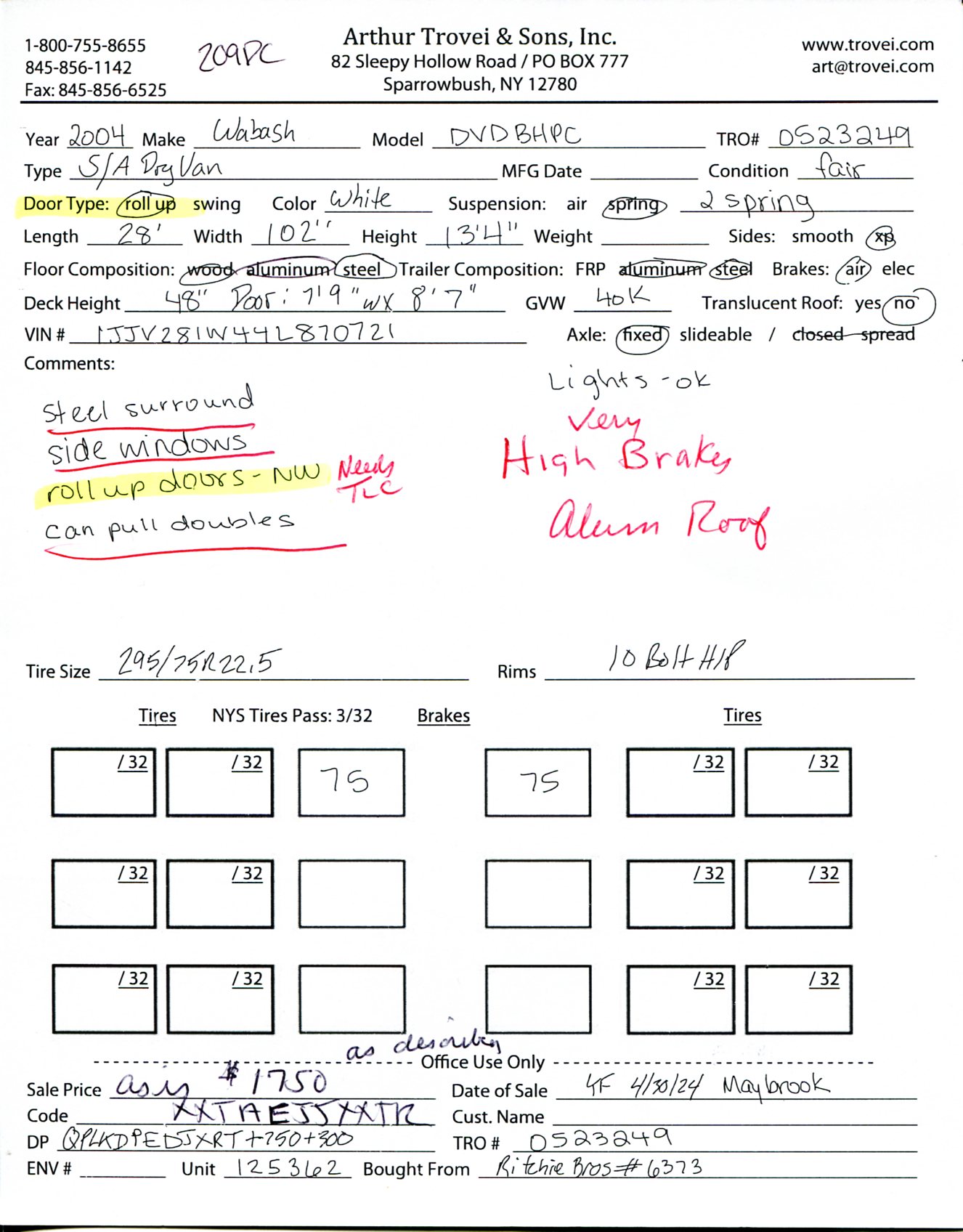 Inventory # 0523249Year: 2004 Make: Wabash Model: DVDBHPC Axles: Fixed Single Type: Dry Box Trailer VIN: 1JJV281W44L870721 Suspension: 2 Spring Tires: 275/80R22.5 / 295/75R22.5 Rims: 10 Bolt Hub Pilot - Steel Length: 28' Width: 102" Height: 13'4" Weight (Estimated): 8,920 lb GVW: 40,000 lb Floor Composition: Wood / Steel / Aluminum Trailer Composition: Aluminum / Steel Door Type: Roll Up - Steel Surround (Not Working) Door Opening Width: 7'9" Door Opening Height: 8'7" Added Details: Air Brakes, Can Pull Doubles, Aluminum Roof, Side Windows, Vertical Logistics, Some Aluminum Crossmembers Price: $1,750 as is as described 209DCXXTAEJJXXTQRTVDPEDJXRT+750+300 Terms of Sale