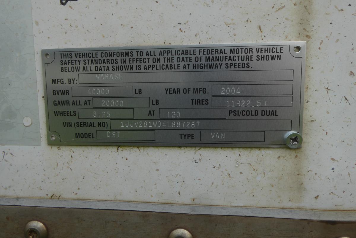Inventory # 0524245Year: 2004 Make: Wabash Model: DVDBHPC Axles: Fixed Single Type: Dry Box Trailer VIN: 1JJV281W04L887287 Suspension: 2 Spring Tires: 295/75R22.5 Rims: 10 Bolt Hub Pilot - Steel Length: 28' Width: 102" Height: 13'4" Weight (Estimated): 8,920 lb GVW: 40,000 lb Floor Composition: Wood / Steel / Aluminum Trailer Composition: Aluminum / Steel Door Type: Roll Up - Steel Surround Door Opening Width: 7'9" Door Opening Height: 8'7" Added Details: Air Brakes, Can Pull Doubles, Side Windows, Aluminum Roof, Vertical Logistics, Some Aluminum Crossmembers Price: $1,800 NNY 209DCXXTAEJJXXTQRTVDPEDJXRT+750+300 Terms of Sale