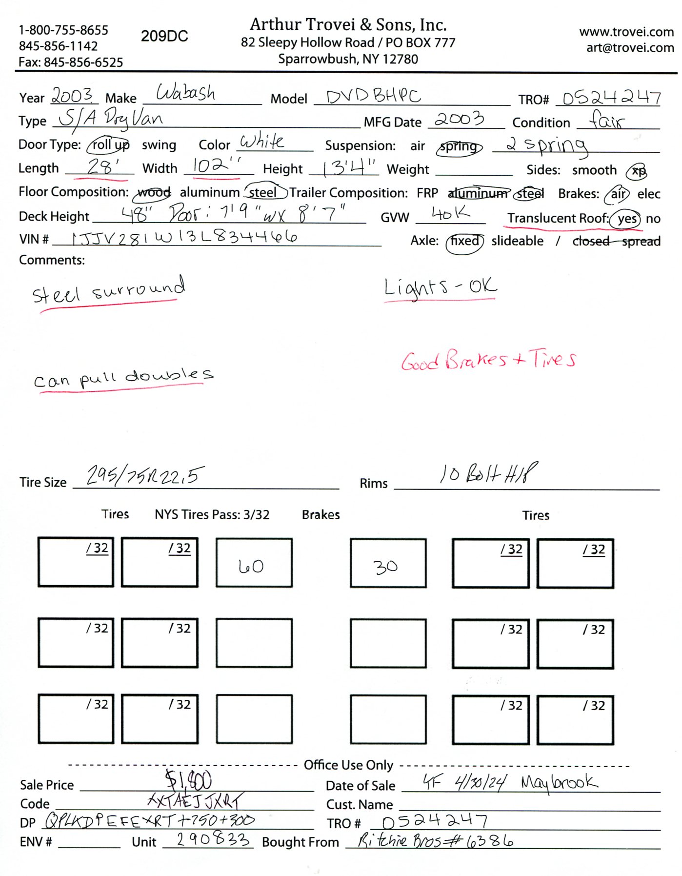Inventory # 0524247Year: 2003 Make: Wabash Model: DVDBHPC Axles: Fixed Single Type: Dry Box Trailer VIN: 1JJV281W13L834466 Suspension: 2 Spring Tires: 295/75R22.5 Rims: 10 Bolt Hub Pilot - Steel Length: 28' Width: 102" Height: 13'4" Weight (Estimated): 8,920 lb GVW: 40,000 lb Floor Composition: Wood / Steel Trailer Composition: Aluminum / Steel Door Type: Roll Up - Steel Surround Door Opening Width: 7'9" Door Opening Height: 8'7" Added Details: Air Brakes, Can Pull Doubles, Translucent Roof, Vertical Logistics Price: $1,800 209DCXXTAEJJXXTQRTVDPEFEXRT+750+300 Terms of Sale