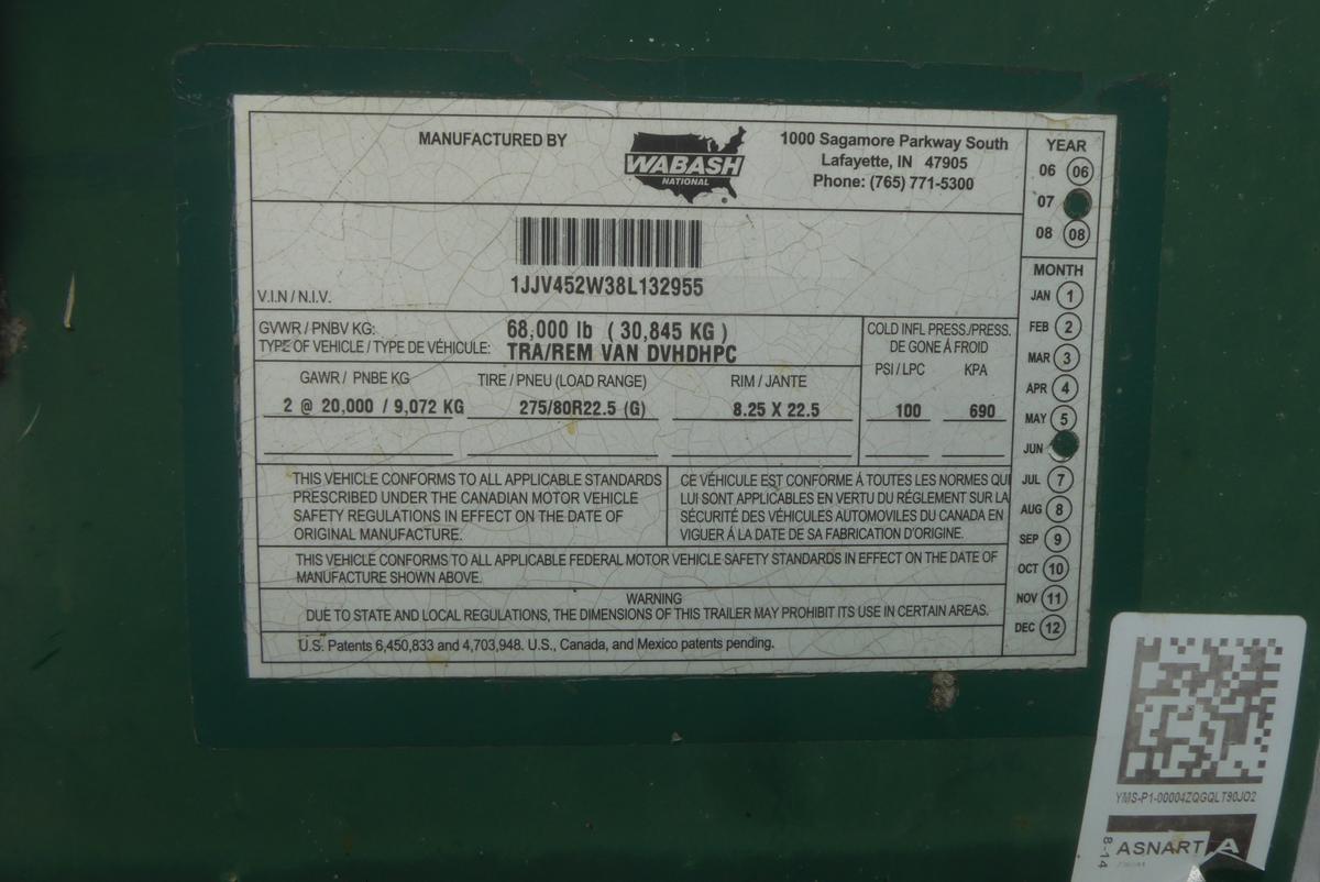 Inventory # 0525249Year: 2008 Make: Wabash Model: DVHDHPC Axles: Slideable Closed Tandem Type: Dry Box Trailer VIN: 1JJV452W38L132955 Suspension: 4 Spring Tires: 275/80R22.5 / 295/75R22.5 Rims: 10 Bolt Hub Pilot - All Steel Length: 45' Width: 8' Height: 12'4" Weight (Estimated): 13,260 lb Load Width: 7'3" Load Height: 7'11" GVWR: 68,000 lb Trailer Composition: Steel Floor Composition: Wood / Steel Door Type: Roll Up Door - Steel Surround Added Details: Air Brakes, Translucent Roof Price: $3,900 as described 209DCXXTBIJJXXTRQPLKDPEIJXRT+750+300 Terms of Sale