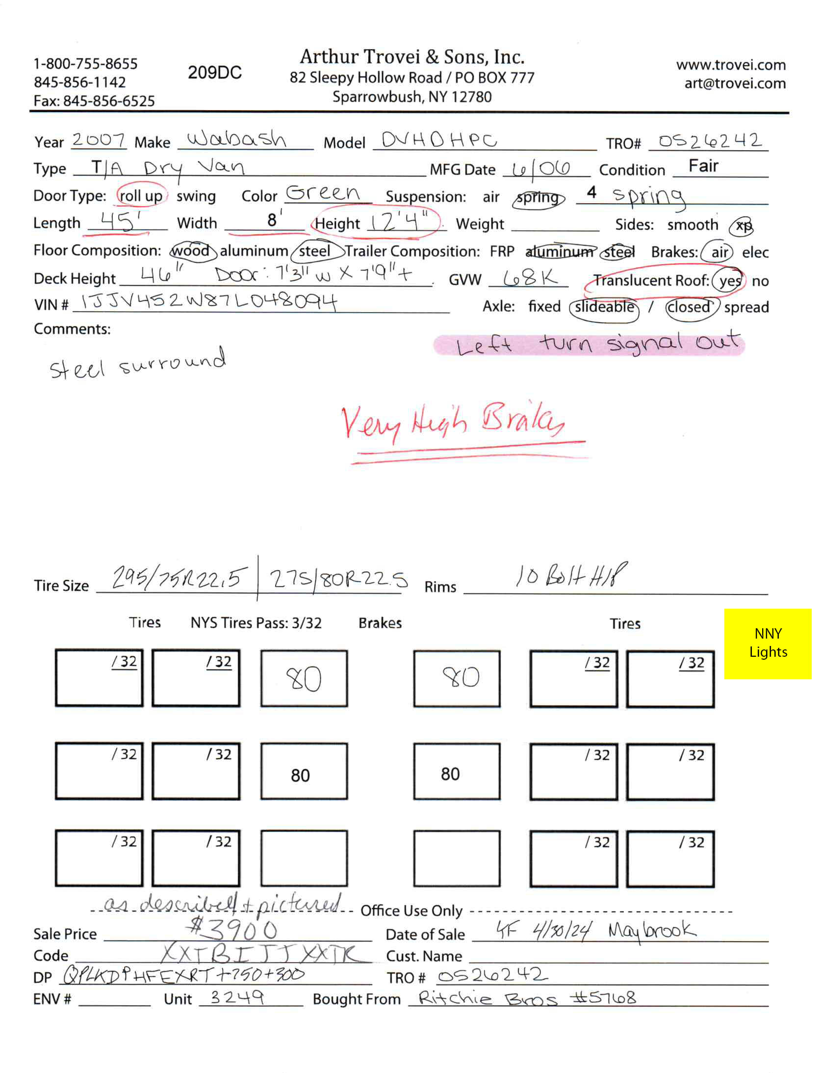 Inventory # 0526242Year: 2007 Make: Wabash Model: DVHDHPC Axles: Slideable Closed Tandem Type: Dry Box Trailer VIN: 1JJV452W87L048094 Suspension: 4 Spring Tires: 275/80R22.5 / 295/75R22.5 Rims: 10 Bolt Hub Pilot - All Steel Length: 45' Width: 8' Height: 12'4" Weight (Estimated): 13,260 lb Load Width: 7'3" Load Height: 7'9" GVWR: 68,000 lb Trailer Composition: Aluminum / Steel Floor Composition: Wood / Steel Door Type: Roll Up Door - Steel Surround Added Details: Air Brakes, Translucent Roof Price: $3,900 as described NNY 209DCXXTBIJJXXTRQPLKDPHFEXRT+750+300 Terms of Sale