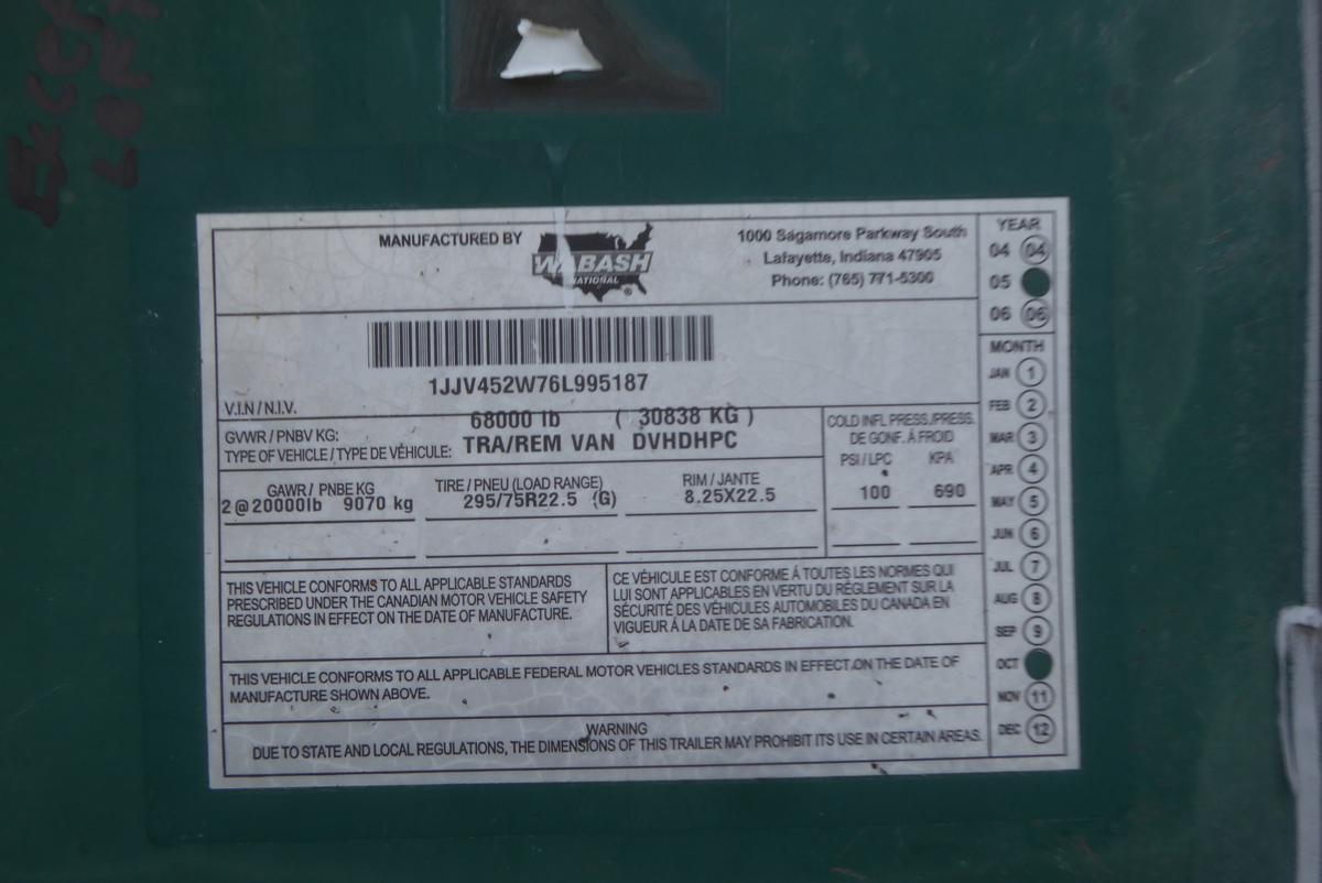 Inventory # 0527245Year: 2006 Make: Wabash Model: DVHDHPC Axles: Slideable Closed Tandem Type: Dry Box Trailer VIN: 1JJV452W76L995187 Suspension: 4 Spring Tires: 275/80R22.5 / 295/75R22.5 Rims: 10 Bolt Hub Pilot - All Steel Length: 45' Width: 8' Height: 12'6" Weight (Estimated): 13,260 lb Load Width: 7'3" Load Height: 7'9" GVWR: 68,000 lb Trailer Composition: Aluminum / Steel Floor Composition: Wood / Steel Door Type: Roll Up Door - Steel Surround Added Details: Air Brakes, Aluminum Roof Price: $3,250 NNY 209DCXXTBHJJXXTRQPLKDPGFEXRT+750+300 Terms of Sale