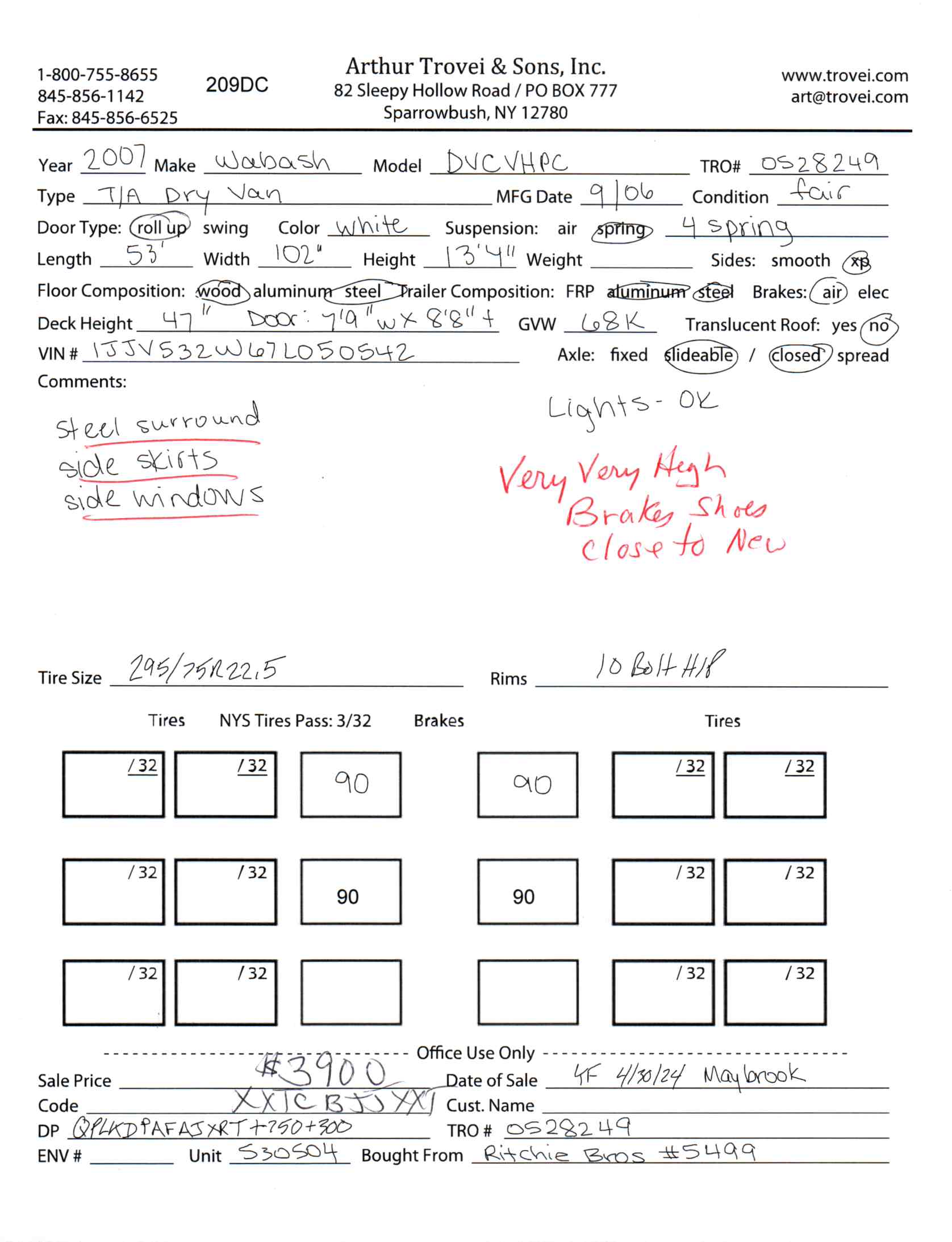 Inventory # 0528249Year: 2007 Make: Wabash Model: DVCVHPC Axles: Slideable Closed Tandem Type: Dry Box Trailer VIN: 1JJV532W67L050542 Suspension: 4 Spring Tires: 275/80R22.5 / 295/75R22.5 Rims: 10 Bolt Hub Pilot - Steel Length: 53' Width: 102" Height: 13'4" Weight (Estimated): 15,460 lbs Load Width: 7'9" Load Height: 8'8" GVWR: 68,000 lb Trailer Composition: Aluminum / Steel Floor Composition: Wood / Steel Door Type: Roll Up Door - Steel Surround Added Details: Aluminum Roof, Air Brakes, Side Windows, Side Skirts Price: $3,900 209DCXXTCBJJXXTRQRTVDPAFAJXRT+750+300 Terms of Sale