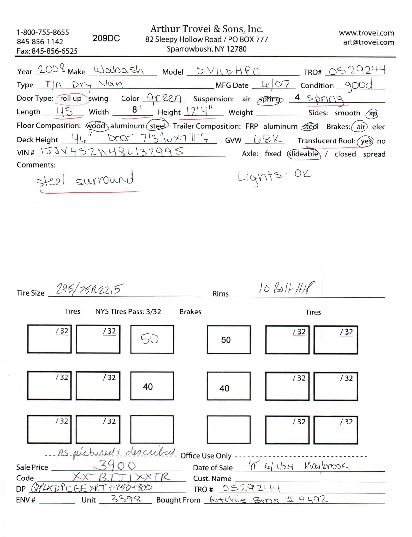 Inventory # 0529244Year: 2008 Make: Wabash Model: DVHDHPC Axles: Slideable Closed Tandem Type: Dry Box Trailer VIN: 1JJV452W48L132995 Suspension: 4 Spring Tires: 295/75R22.5 Rims: 10 Bolt Hub Pilot - All Steel Length: 45' Width: 8' Height: 12'4" Weight (Estimated): 13,260 lb Load Width: 7'3" Load Height: 7'11" GVWR: 68,000 lb Trailer Composition: Steel Floor Composition: Wood / Steel Door Type: Roll Up Door - Steel Surround Added Details: Air Brakes, Translucent Roof Price: $3,900 209DCXXTBIJJXXTRQPLKDPCGEXRT+750+300 Terms of Sale