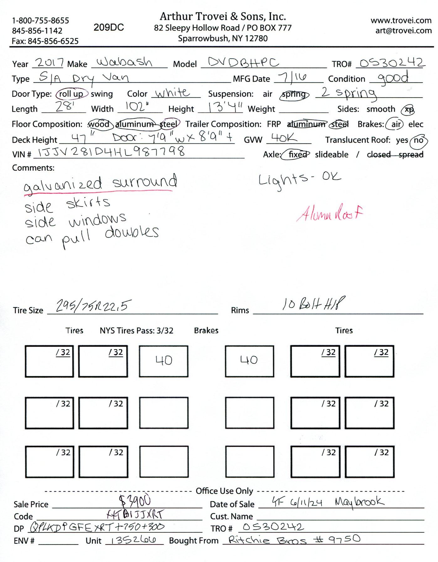 Inventory # 0530242Year: 2017 Make: Wabash Model: DVDBHPC Axles: Fixed single Type: Dry box trailer VIN: 1JJV281D4HL987798 Suspension: 2 Spring Tires: 295/75R22.5 Rims: 10 Bolt Hub Pilot - Steel Length: 28' Width: 102" Height: 13'4" Weight (Estimated): 8,760 lb GVW: 40,000 lb Floor Composition: Wood / Steel / Aluminum Trailer Composition: Steel / Aluminum Door Type: Roll Up - Galvanized Surround Door Opening Width: 7'9" Door Opening Height: 8'9" Added Details: Air Brakes, Side Windows, Can Pull Doubles, Aluminum Roof, Side Skirts, Vertical Logistics Price: $3,900 209DCXXTBIJJXXTQPLKDPGFEXRT+750+300 Terms of Sale