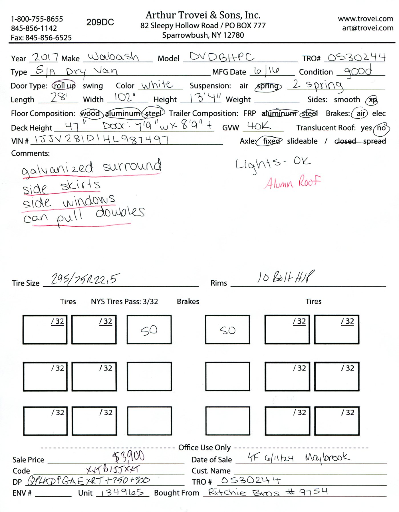 Inventory # 0530244Year: 2017 Make: Wabash Model: DVDBHPC Axles: Fixed single Type: Dry box trailer VIN: 1JJV281D1HL987497 Suspension: 2 Spring Tires: 295/75R22.5 Rims: 10 Bolt Hub Pilot - Steel Length: 28' Width: 102" Height: 13'4" Weight (Estimated): 8,760 lb GVW: 40,000 lb Floor Composition: Wood / Steel / Aluminum Trailer Composition: Steel / Aluminum Door Type: Roll Up - Galvanized Surround Door Opening Width: 7'9" Door Opening Height: 8'9" Added Details: Air Brakes, Side Windows, Can Pull Doubles, Aluminum Roof, Side Skirts, Vertical Logistics Price: $3,900 209DCXXTBIJJXXTQPLKDPGAEXRT+750+300 Terms of Sale