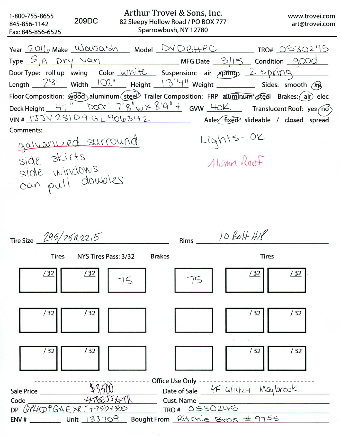 Inventory # 0530245Year: 2016 Make: Wabash Model: DVDBHPC Axles: Fixed single Type: Dry box trailer VIN: 1JJV281D9GL906342 Suspension: 2 Spring Tires: 295/75R22.5 Rims: 10 Bolt Hub Pilot - Steel Length: 28' Width: 102" Height: 13'4" Weight (Estimated): 8,940 lb GVW: 40,000 lb Floor Composition: Wood / Steel Trailer Composition: Steel / Aluminum Door Type: Roll Up - Galvanized Surround Door Opening Width: 7'8" Door Opening Height: 8'9" Added Details: Air Brakes, Side Windows, Can Pull Doubles, Aluminum Roof, Side Skirts, Vertical Logistics Price: $3,500 209DCXXTBEJJXXTRQPLKDPGAEXRT+750+300 Terms of Sale