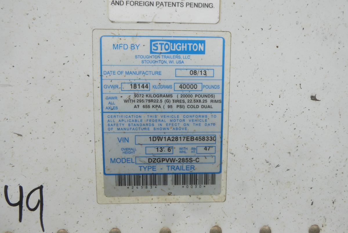 Inventory # 0530249Year: 2014 Make: Stoughton Model: DZGPVW-285S-C Axles: Fixed Single Type: Dry Box Trailer VIN: 1DW1A2817EB458330 Suspension: 2 Spring Tires: 295/75R22.5 Rims: 10 Bolt Hub Pilot - Steel Length: 28' Width: 102" Height: 13'6" Weight (Approximate): 8,540 lb GVW: 40,000 lb Floor Composition: Wood / Steel Trailer Composition: Steel / Aluminum Door Type: Roll Up - Steel Surround Door Opening Width: 7'8" Door Opening Height: 8'8" Added Details: Air Brakes, Can Pull Doubles, Aluminum Roof, Side Windows, Side Skirts Price: $2,900 KSTXXTBCJJXXTRQPLKDPFDJXRT+750+300 Terms of Sale