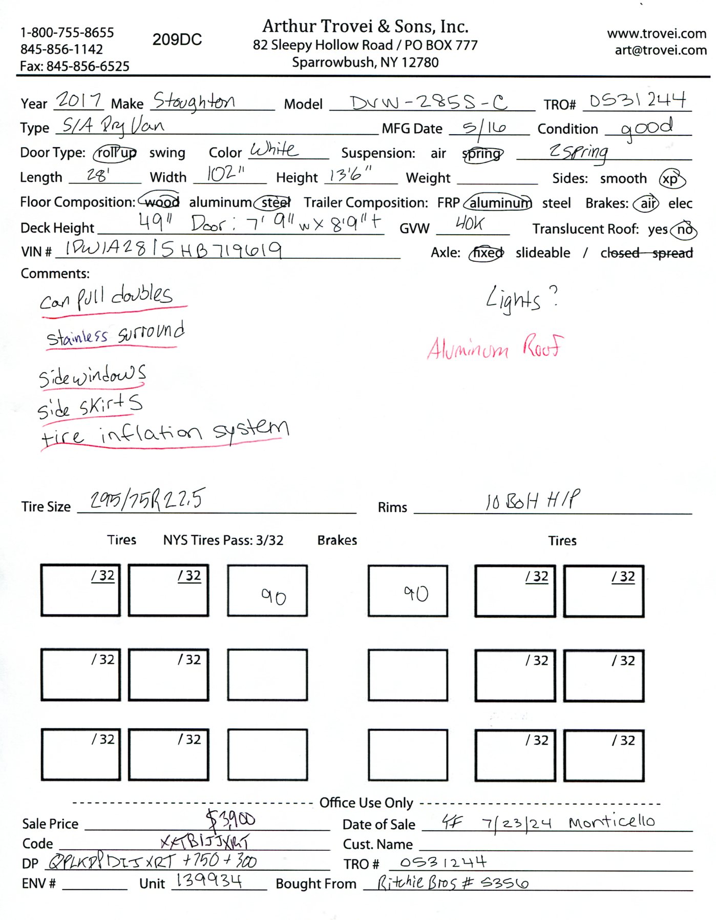 Inventory # 0531244Year: 2017 Make: Stoughton Model: DVW-285S-C Axles: Fixed Single Type: Dry Box Trailer VIN: 1DW1A2815HB719619 Suspension: 2 Spring Tires: 295/75R22.5 Rims: 10 Bolt Hub Pilot - Steel Length: 28' Width: 102" Height: 13'6" Weight (Estimated): 8,260 lb GVW: 40,000 lb Floor Composition: Wood / Steel Trailer Composition: Aluminum Door Type: Roll Up - Stainless Surround Door Opening Width: 7'9" Door Opening Height: 8'9" Added Details: Air Brakes, Can Pull Doubles, Side Windows, Side Skirts, Aluminum Roof, Tire Inflation System Price: $3,900 209DCXXTBIJJXXTQPLKDPDIEXRT+750+300 Terms of Sale