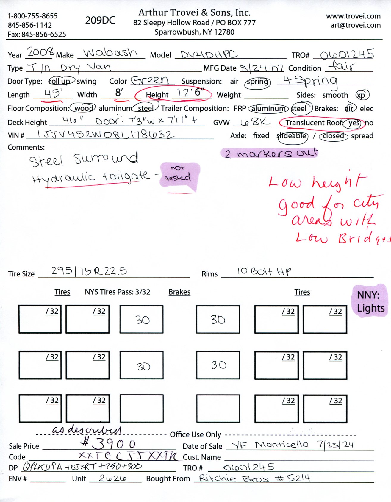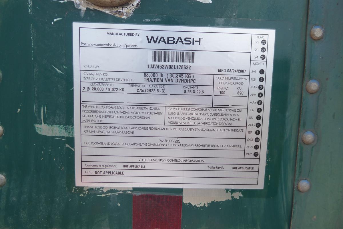 Inventory # 0601245Year: 2008 Make: Wabash Model: DVHDHPC Axles: Slideable Closed Tandem Type: Dry Box Trailer VIN: 1JJV452W08L178632 Suspension: 4 Spring Tires: 295/75R22.5 Rims: 10 Bolt Hub Pilot - Steel Length: 45' Width: 8' Height: 12'6" Weight (Estimated): 13,260 lb Load Width: 7'3" Load Height: 7'11" GVWR: 68,000 lb Trailer Composition: Aluminum / Steel Floor Composition: Wood / Steel Door Type: Roll Up Door - Steel Surround Tailgate Details: Thieman - Not Tested Added Details: Air Brakes, Translucent Roof Price: $3,900 as described 209DCXXTCCJJXXTRQPLKDPAHDJXRT+750+300 Terms of Sale
