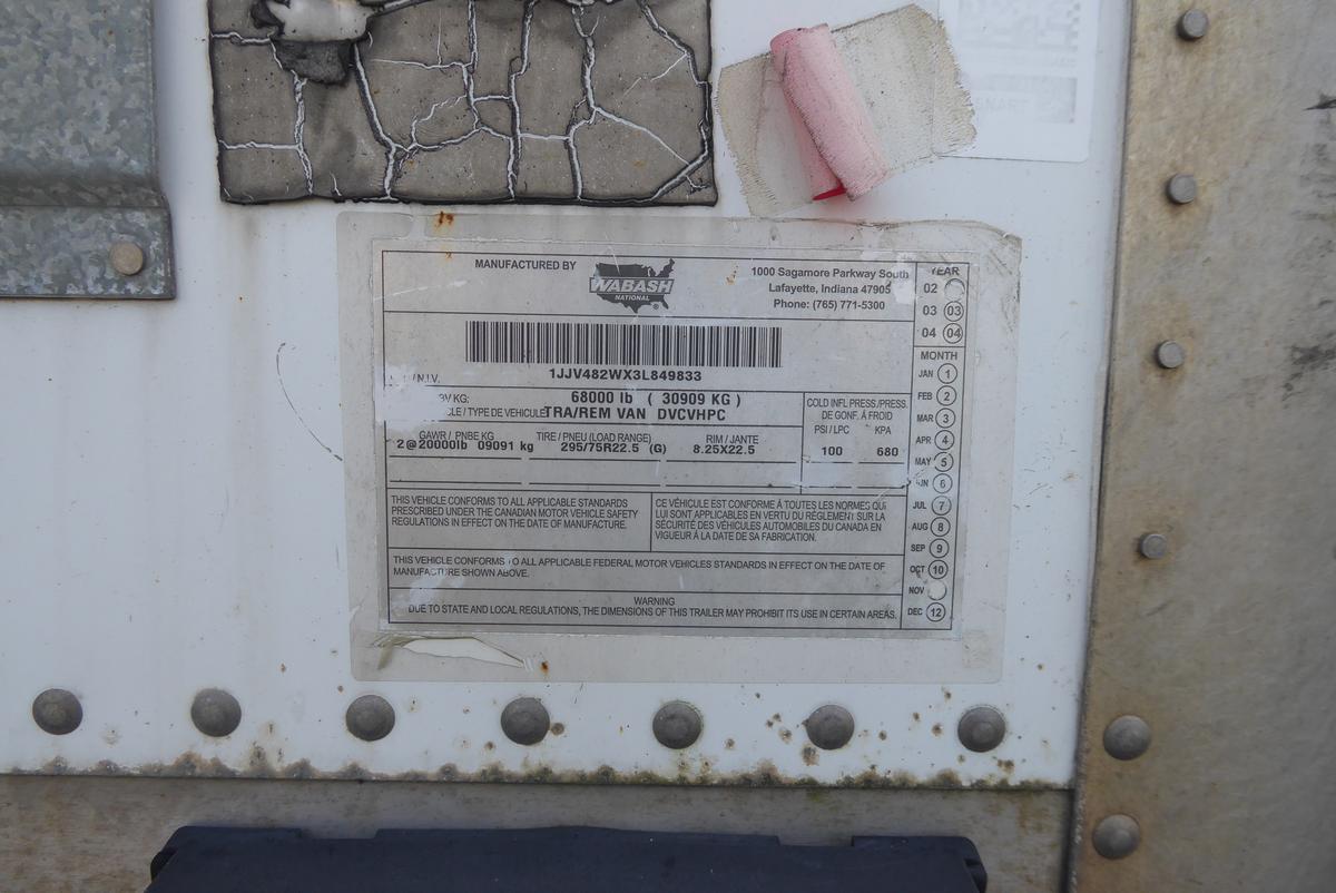Inventory # 0601248Year: 2003 Make: Wabash Model: DVCVHPC Axles: Slideable Closed Tandem Type: Dry Box Trailer VIN: 1JJV482WX3L849833 Suspension: 4 Spring Tires: 295/75R22.5 Rims: 10 Bolt Hub Pilot - Steel Length: 48' Width: 102" Height: 13'6" Load Width: 7'10" Load Height: 8'9" Weight (Estimated): 13,980 lb GVWR: 68,000 lb Trailer Composition: Steel Floor Composition: Wood / Steel Door Type: Roll Up Door - Steel Surround Added Details: Air Brakes, Aluminum Roof Price: $2,900 209DCXXTBCJJXXTRQPLKDPGFEXRT+750+300 Terms of Sale
