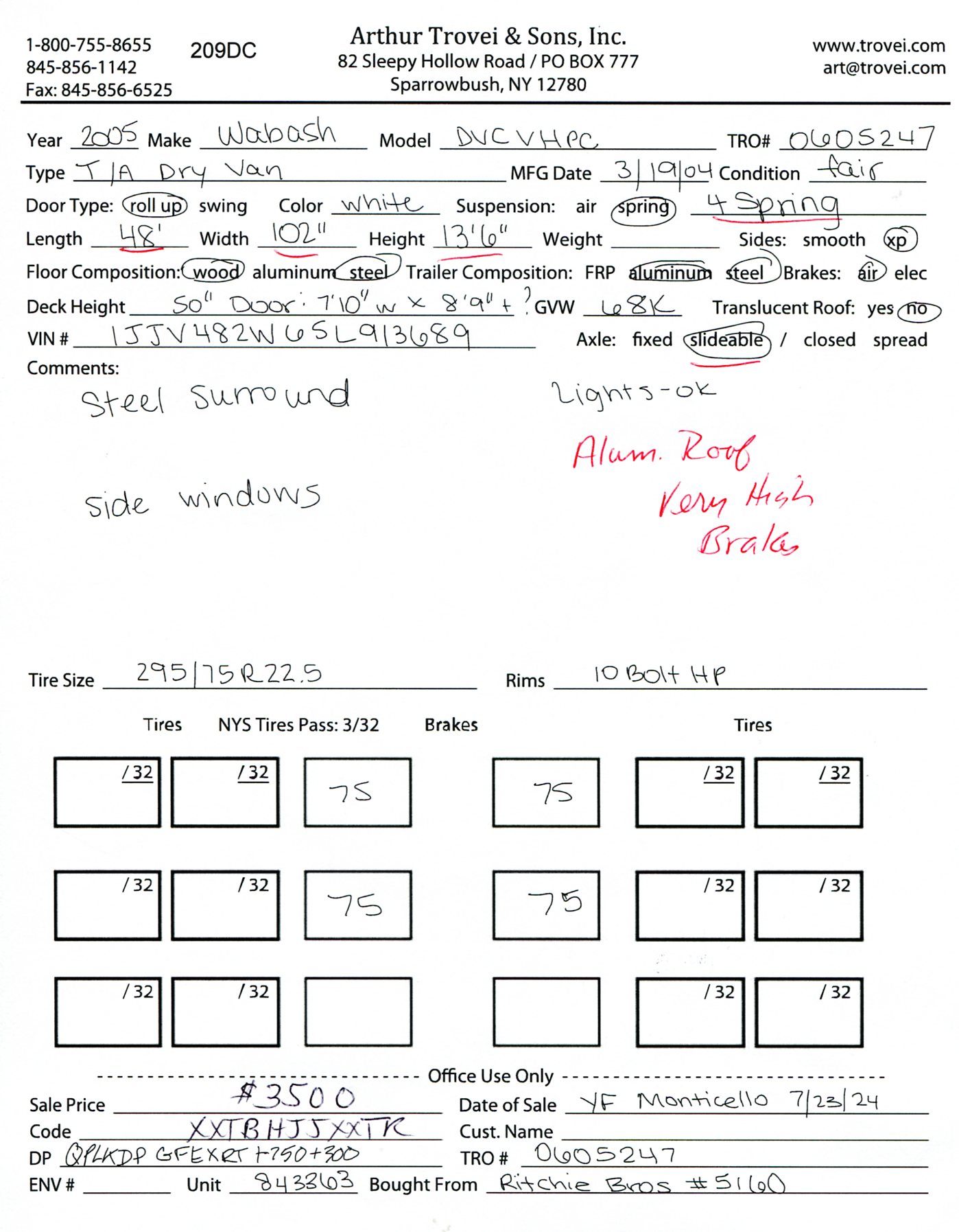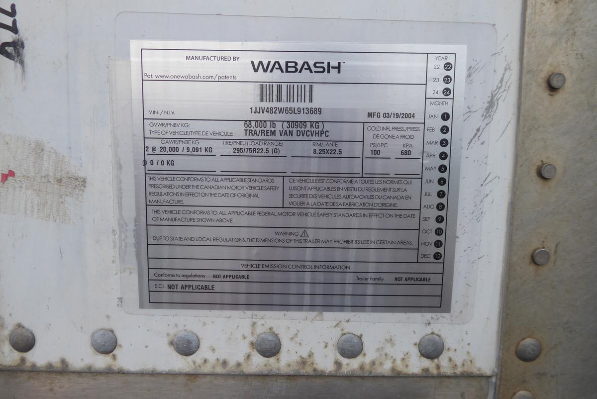 Inventory # 0605247Year: 2005 Make: Wabash Model: DVCVHPC Axles: Slideable Closed Tandem Type: Dry Box Trailer VIN: 1JJV482W65L913689 Suspension: 4 Spring Tires: 295/75R22.5 Rims: 10 Bolt Hub Pilot - Steel Length: 48' Width: 102" Height: 13'6" Load Width: 7'10" Load Height: 8'9" Weight (Estimated): 13,980 lb GVWR: 68,000 lb Trailer Composition: Aluminum / Steel Floor Composition: Wood / Steel Door Type: Roll Up Door - Steel Surround Added Details: Air Brakes, Aluminum Roof, Side Windows Price: $3,500 209DCXXTBHJJXXTQPLKDPGFEXRT+750+300 Terms of Sale