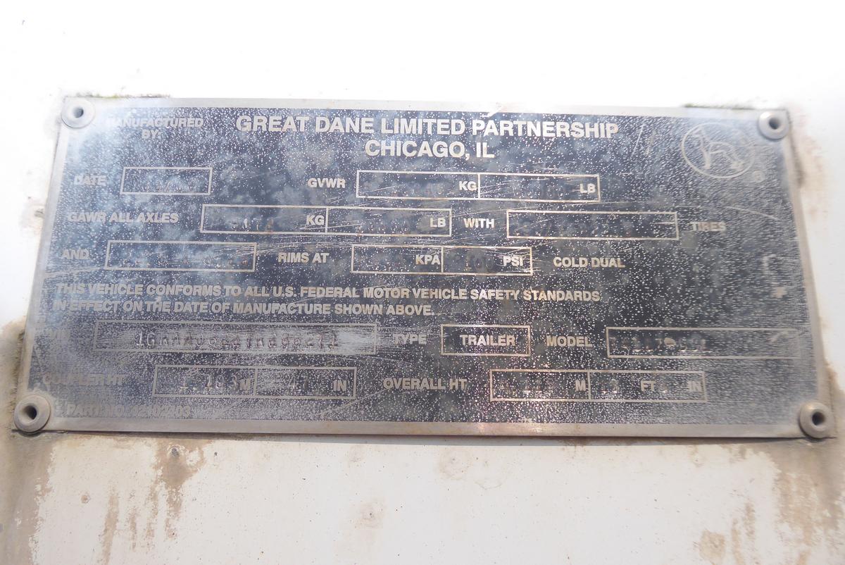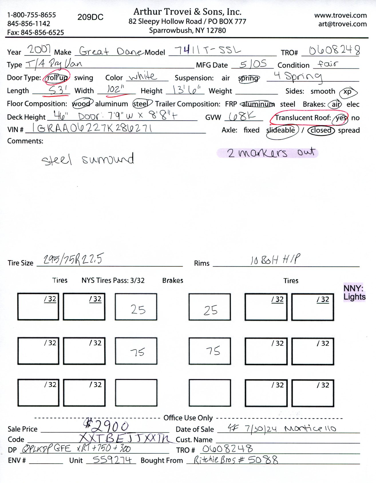 Inventory # 0608248Year: 2007 Make: Great Dane Model: 7411T-SSL Axles: slideable closed tandem Type: Dry Box Trailer VIN: 1GRAA06227K286271 Suspension: 4 Spring Tires: 295/75R22.5 Rims: 10 Bolt Hub Pilot - Steel Length: 53' Width: 102" Height: 13'6" Load Width: 7'9" Load Height: 8'8" Weight (Estimated): 15,260 lb GVWR: 68,000 lb Trailer Composition: Aluminum Floor Composition: Wood / Steel Door Type: Roll Up Door - Steel Surround Added Details: Translucent Roof Price: $2,900 NNY 209DCXXTBEJJXXTRQRTVDPGFEXRT+750+300 Terms of Sale