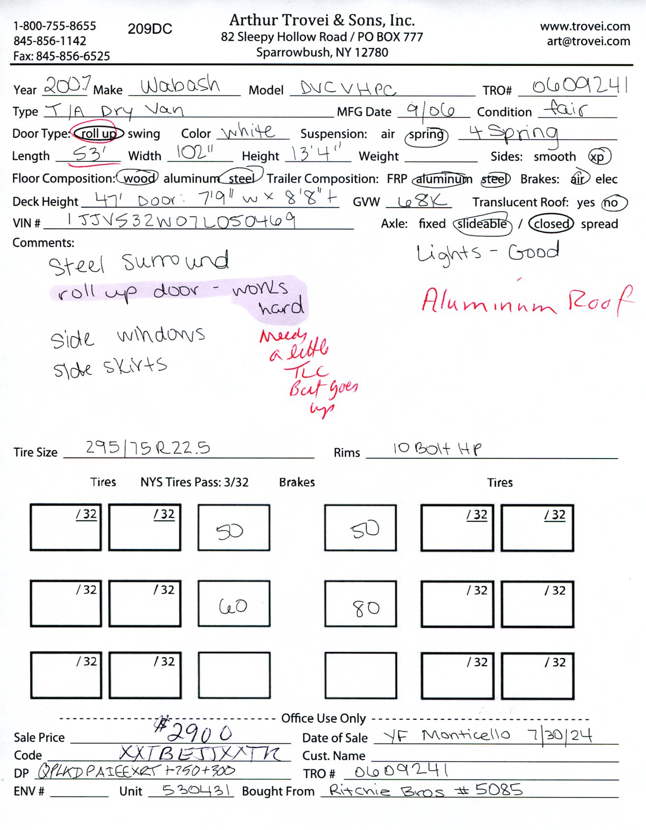 Inventory # 0609241Year: 2007 Make: Wabash Model: DVCVHPC Axles: Slideable Closed Tandem Type: Dry Box Trailer VIN: 1JJV532W07L050469 Suspension: 4 Spring Tires: 295/75R22.5 Rims: 10 Bolt Hub Pilot - Steel Length: 53' Width: 102" Height: 13'4" Load Width: 7'9" Load Height: 8'8" Weight (Estimated): 15,460 lb GVWR: 68,000 lb Trailer Composition: Aluminum / Steel Floor Composition: Wood / Steel Door Type: Roll Up Door - Steel Surround (Works Hard) Added Details: Aluminum Roof, Air Brakes, Side Windows, Side Skirts Price: $2,900 209DCXXTBEJJXXTRQRTVDPAIEEXRT+750+300 Terms of Sale