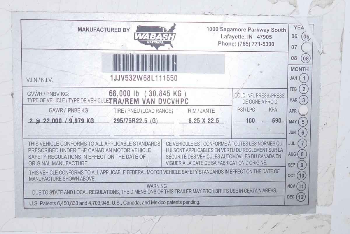 Inventory # 0609248Year: 2008 Make: Wabash Model: DVCVHPC Axles: Slideable Closed Tandem Type: Dry Box Trailer VIN: 1JJV532W68L111650 Suspension: 4 Spring Tires: 295/75R22.5 Rims: 10 Bolt Hub Pilot - Steel Length: 53' Width: 102" Height: 13'4" Load Width: 8'2" Load Height: 8'10" Weight (Estimated): 14,760 lb GVWR: 68,000 lb Trailer Composition: Aluminum / Steel Floor Composition: Wood / Steel Door Type: Roll Up Door - Steel Surround Added Details: Vertical Logistics, Aluminum Roof, Side Windows, Side Skirts Price: $3,500 NNY 209DCXTRBIJJXXTQPLKDPAIEEXRT+750+300 Terms of Sale