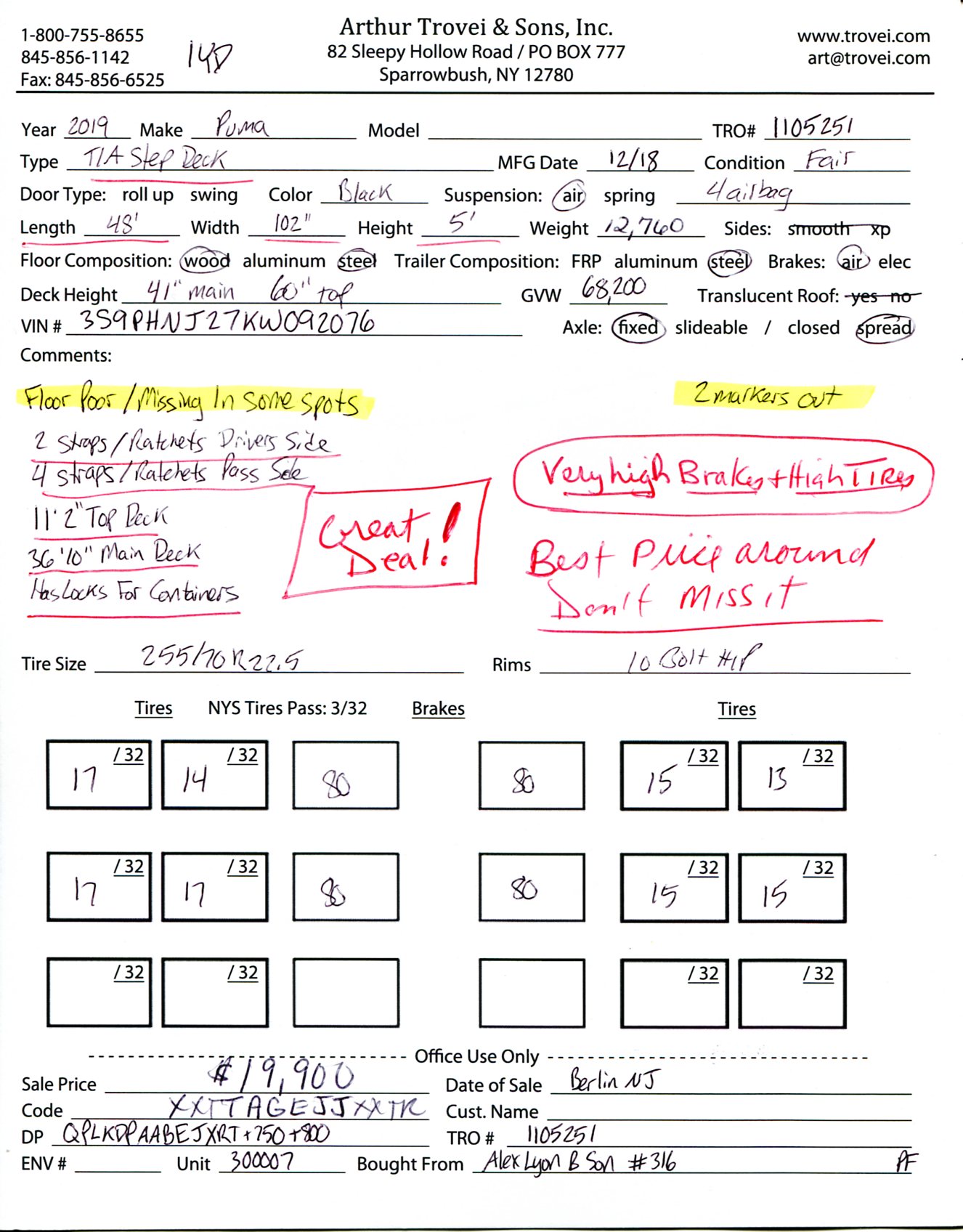 Inventory # 1105251Year: 2019 Make: Puma Model: Axles: Fixed Spread Tandem Type: Flatbed Step Deck Trailer VIN: 3S9PHNJ27KW092076 Suspension: 4 Air Bag Tires: 255/70R22.5 Rims: 10 Bolt Hub Pilot Length: 48' Width: 102" Height: 5' Deck Height: Main 41" - Front Upper 60" Weight: 12,760 lb GVWR: 68,200 lb Trailer Composition: Steel Floor Composition: Wood / Steel (Some Wood Missing Or Poor) Deck Dimensions: 11'2" Front Upper Deck, 36'10" Main Deck Added Details: 6 Ratchets / Straps Total, Has Locks To Carry Containers Price: $19,900 1YDXXTAGEJJXXTQPLKDPAABEJXRT+750+800 Terms of Sale