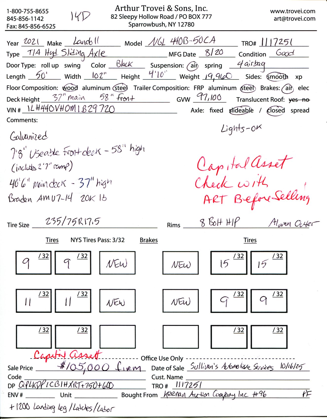 Inventory # 1117251Year: 2021 Make: Landoll Model: 440B-50CA NGL Axles: Tandem Type: Tandem Axle Hydraulic Trailer VIN: 1LH440VH0M1B29720 Suspension: 4 Air Bag Tires: 235/75R17.5 Rims: 8 Bolt Hub Pilot - Aluminum Outer Trailer Composition: Steel (Galvanized) Floor Composition: Wood/Steel Length: 50' Width: 102" Height: 4'10" Deck Height: 40'6" Lower Deck at 37", 7'8" Usable Upper Deck With Ramp (2'7") At 58" Weight (Empty): 19,960 lb GVW: 97,100 lb Added Details: Hydraulic Sliding Axle, 20,000 lb Braden Winch, Galvanized Trailer Price: $105,000 Firm CA 1YDQPLKDPICBIHXRT+750+600+1200 Print This Page | Back to Drop Deck Trailers Inventory | Ask A Question Terms of Sale
