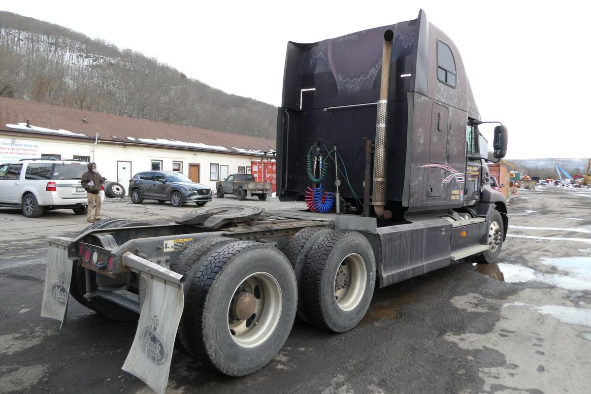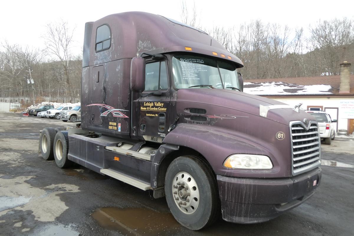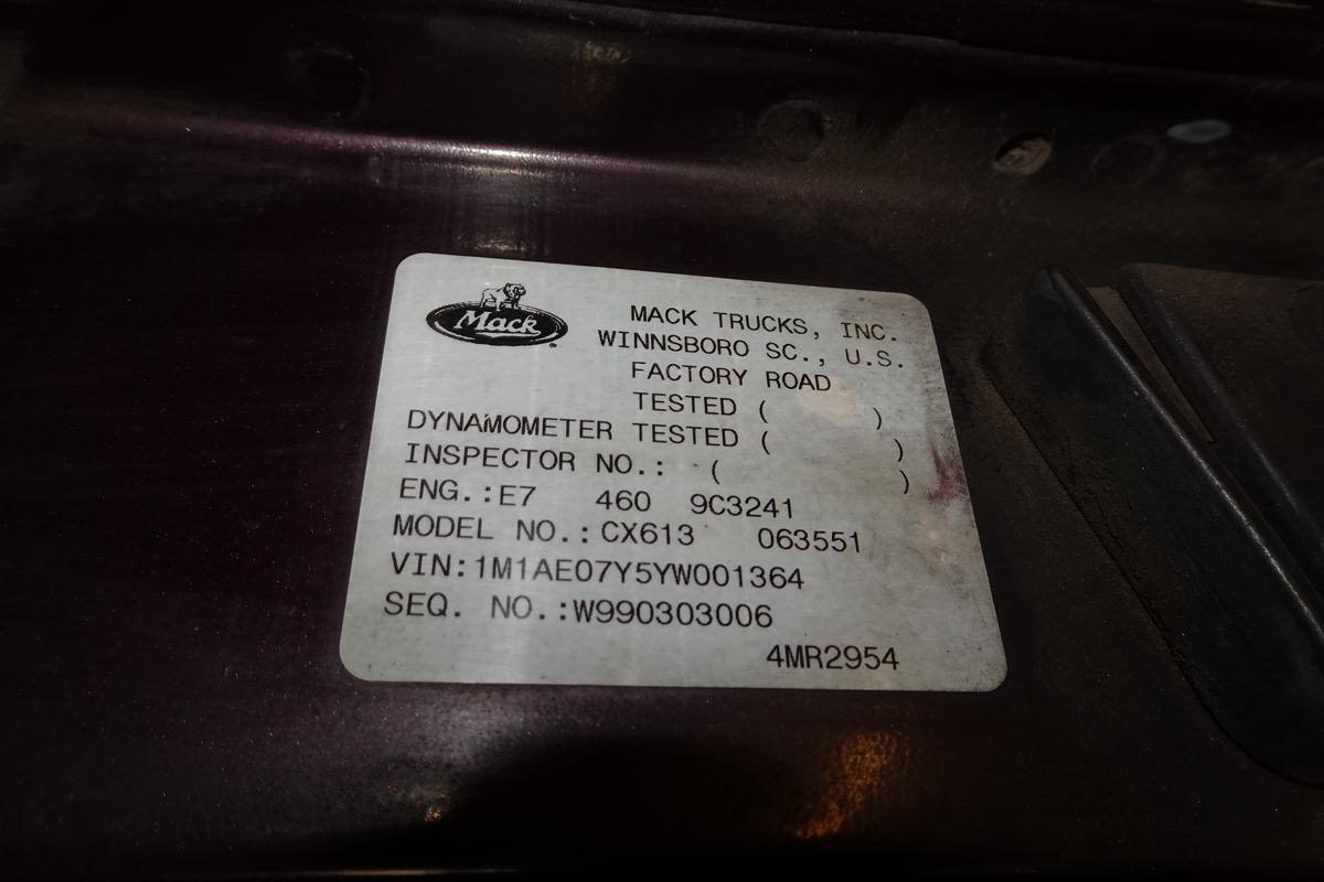 Inventory # 0212261Year: 2000 Make: Mack Model: CX613 Type: Tandem Axle Sleeper Cab Tractor VIN: 1M1AE07Y5YW001364 Motor: Mack E7 Etech Elec 460 HP Air to Air: Yes Air Conditioning: Yes (Not Working) Engine Brake: Jake DEF: No Transmission: Fuller RTLO16610B 10 Speed PTO: No Wetline: No Front Axle: 12,000 lb Rear: Eaton DS405 40,000 lb Ratio: 3.70 Power Divider: Yes Suspension: Mack 4 Air Bag 40,000 lb Tires: 11R24.5 Rims: 10 Bolt Hub Pilot - Aluminum Odometer Reading: 462,741 ECM: Hour Meter Reading: 17,879 Computer Hour Reading: Length: 27'3" Width: 8' Height: 12'6" Wheelbase: 220" Cab to Axle: 93" Cab to End: 141" Weight: 17,460 lb GVW: 52,000 lb Sleeper Details: Air Ride 64" High Roof Added Details: Runs Well, Single Frame, Air Slide 5th Wheel Price: $9,900 as described NNY 3RVXXTGIJJXXTRQPLKDPAEJJXRT+750+500 Terms of Sale