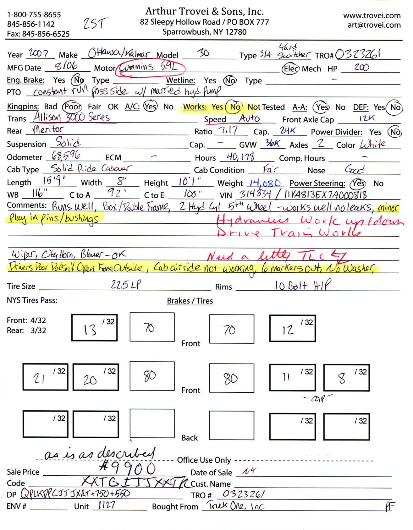 Inventory # 0323261Year: 2007 Make: Ottawa Model: 30 Type: Single Axle Yard Switcher VIN: 314834 / 11VA813EX7A000818 Motor: Cummins ISB 5.9L Elec 200 HP Air to Air: Yes Air Conditioning: Yes (Not Working) DEF: No Wetline: Hydraulics For 5th Wheel PTO: Constant Run Passenger Side With Married Hydraulic Pump - Separate Cable Operated Control Valve Transmission: Allison 3000 Series Automatic Rear: Meritor 24,000 lb Ratio: 7.17 Suspension: Solid Ride Tires: 22.5LP Rims: 10 Bolt Hub Pilot - Steel Odometer Reading: 68,596 ECM: Hour Meter Reading: 40,178 Length: 15'9" Width: 8' Height: 10'1" Wheelbase: 116" Cab to Axle: 92" Cab to End: 100" Weight: 14,080 lb GVW: 36,000 lb Added Details: Runs Well, Box / Double Frame, Hydraulic 5th Wheel - Power Up / Power Down - 2 Hydraulic Cylinders, Works Well, No Leaks, Minor Play In Pins / Bushings Price: $9,900 as is as described NNY 2STXXTGIJJXXTRQPLKDPCJJJXRT+750+550 Print This Page | Back to Yard Switcher Inventory | Ask A Question Terms of Sale