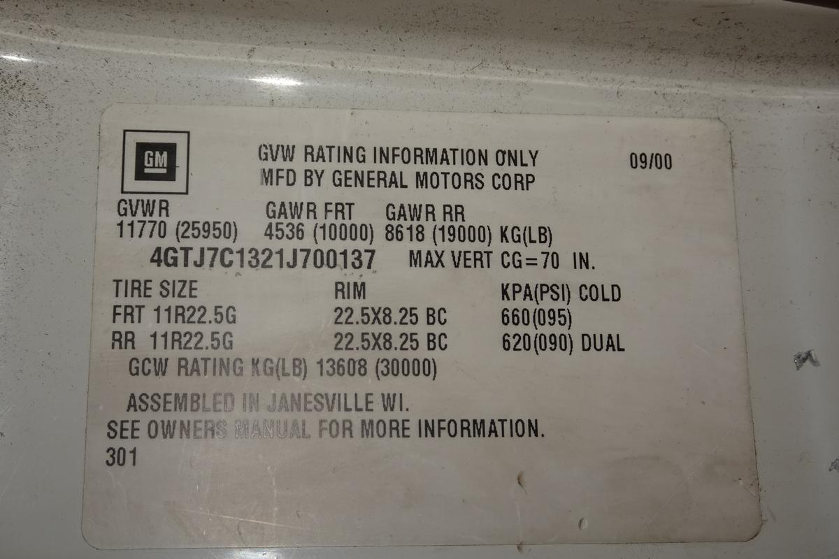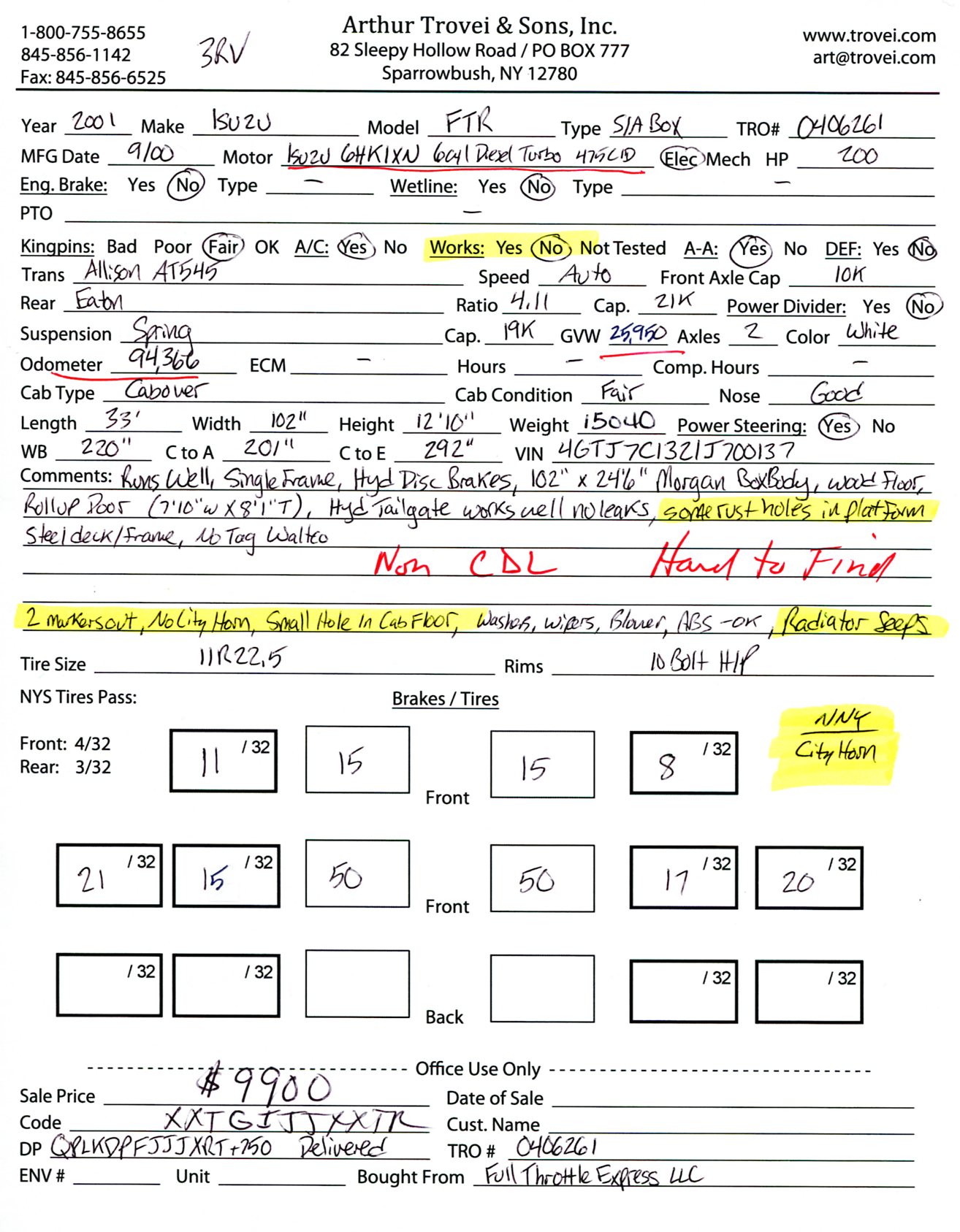 Inventory # 0406261Year: 2001 Make: Isuzu Model: FTR Type: Single Axle Box Truck VIN: 4GTJ7C1321J700137 Motor: Isuzu 6HK1XN 6 Cylinder Turbo Diesel Elec 475 CID 200 HP Engine Brake: No Air to Air: Yes DEF: Yes Air Conditioning: Yes (Not Working) Transmission: Allison AT545 Automatic PTO: No Front Axle: 10,000 lb Rear: Eaton 21,000 lb Ratio: 4.11 Suspension: Spring 12,980 lbs Tires: 11R22.5 Rims: 10 Bolt Hub Pilot Odometer Reading: 94,366 ECM: Hour Meter Reading: Computer Hour Reading: Length: 33' Width: 8'6" Height: 12'10" Wheelbase: 220" Cab to Axle: 201" Cab to End: 292" Weight: 15,040 lb GVW: 25,950 lb Box Details: 102" Wide x 24'6" long Morgan Box Body - Rear Roll Up Door (7'10" W x 8'1" T), Steel Surround, Wood Floor, Aluminum Roof Liftgate Details: Waltco Hydraulic Liftgate - No Tag - Steel Deck (Rust Holes) / Frame - Works Well, No Leaks Added Details: Runs Well, Single Frame, Hydraulic Disc Brakes, Hole in Cab Floor, Radiator Seeps (Small Puddle Overnight) Price: $9,900 NNY 3RVXXTGIJJXXTRQPLKDPFJJJXRT+750 Terms of Sale