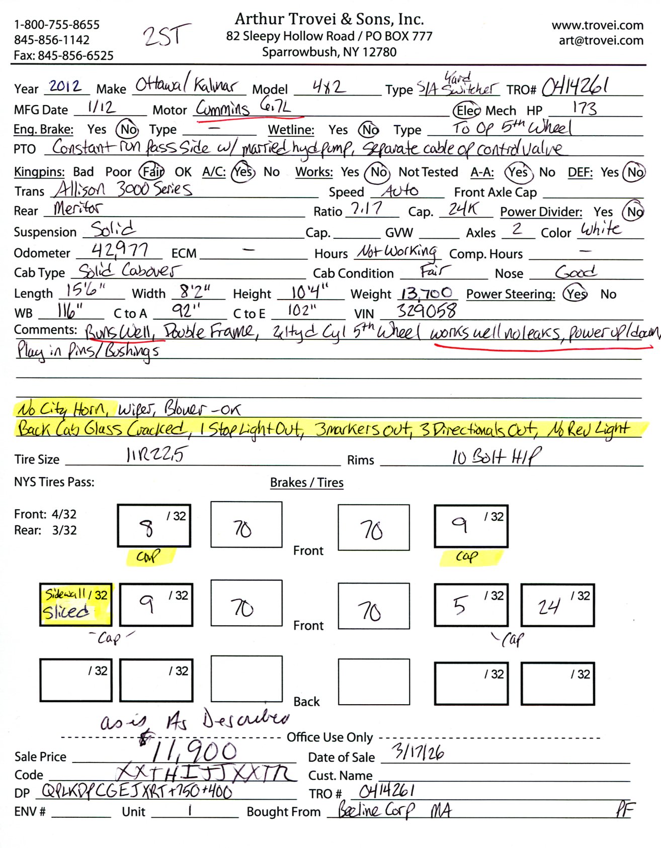 Inventory # 0414261Year: 2012 Make: Ottawa / Kalmar Model: 4x2 Type: Single Axle Yard Switcher VIN: 329058 Motor: Cummins QSB 6.7L Elec 173 HP Air to Air: Yes Wetline: Hydraulics For 5th Wheel PTO: Constant Run Passenger Side With Married Hydraulic Pump - Separate Cable Operated Control Valve Transmission: Allison 3000 Series Automatic Rear: Meritor 24,000 lb Ratio: 7.17 Suspension: Solid Ride Tires: 11R22.5 Rims: 10 Bolt Hub Pilot - Steel Length: 15'6" Width: 8'2" Height: 10'4" Wheelbase: 116" Cab to Axle: 92" Cab to End: 102" Odometer Reading: 42,977 ECM: Hour Meter Reading: Not Working Weight: 13,700 lb GVW: Approx 35,000 lb Added Details: Runs Well, Double Frame, 2 hydraulic Cylinders Power Up / Power Down Hydraulic 5th Wheel - Works Well, No Leaks, Play In Pins / Bushings Price: $11,900 No Title as is as described 2STXXTHIJJXXTRQPLKDPCGEJXRT+750+400 Print This Page | Back to Yard Switcher Inventory | Ask A Question Terms of Sale