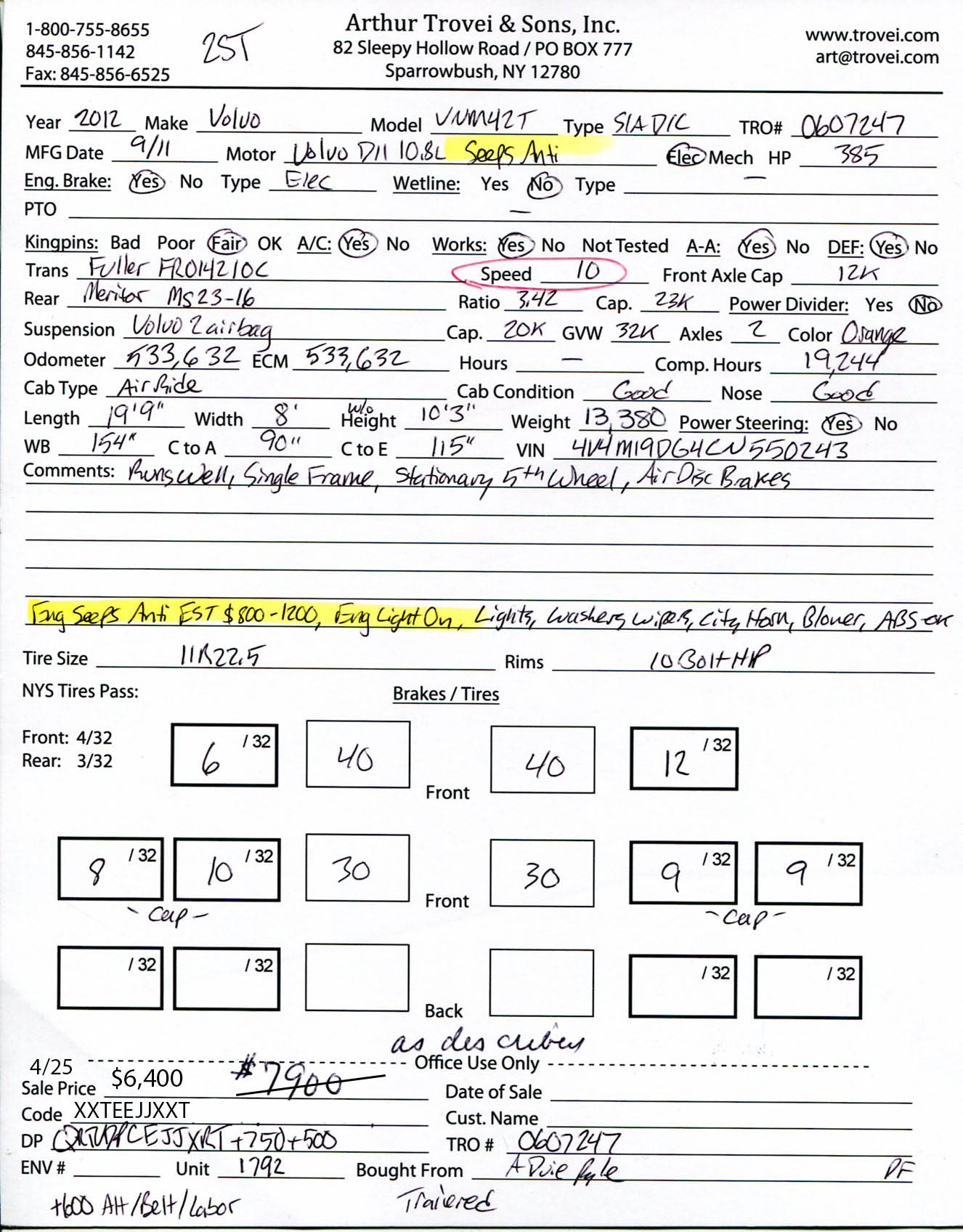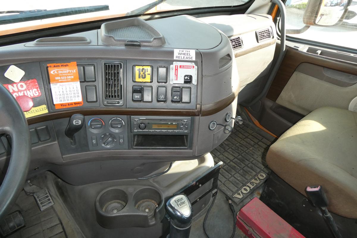 Inventory # 0607247Year: 2012 Make: Volvo Model: VNM42T Type: Single Axle Day Cab Tractor VIN: 4V4M19DG4CN550243 Motor: Volvo D11 10.8L elec 385 hp - Engine Light On - Seeps anti EST $800-1200 to repair Air to Air: Yes Air Conditioning: Yes (Not Working) Engine Brake: Electronic DEF: Yes Transmission: Fuller FRO14210C 10 speed PTO: No Front Axle: 12,000 lb Rear: Meritor MS23-16 23,000 lb Ratio: 3.42 Power Divider: No Suspension: Volvo 2 air bag 20,000 lb Tires: 11R22.5 Rims: 10 bolt hub pilot - steel Odometer Reading: 533,632 ECM: 533,632 Hour Meter Reading: ECM Hour Reading: 19,244 Length: 19'9" Width: 8' Height: 10'3" Wheelbase: 154" Cab to Axle: 90" Cab to End: 115" Weight: 13,380 lbs GVW: 32,000 lbs Added Features: Runs Well - Engine Light On - Seeps anti EST $800-1200 to repair, single frame, stationary 5th wheel, air disc brakes Price: 2STXXTEEJJXXTRQRTVDPCEJJXRT+750+500+600 Terms of Sale