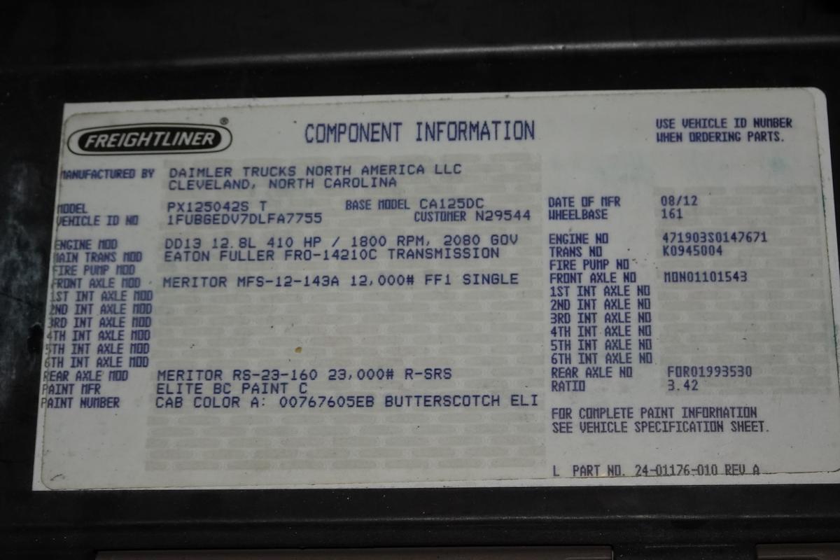 Inventory # 0610243Year: 2013 Make: Freightliner Model: Cascadia 125 Type: Single Axle Day Cab Tractor VIN: 1FUBGEDV7DLFA7755 Motor: Detroit DD13 12.8L elec 410/500 hp - Engine Light On - Idle Only Air to Air: Yes Air Conditioning: Yes (Works) Engine Brake: Electronic DEF: Yes Transmission: Fuller FRO14210C 10 speed PTO: No Front Axle: 12,000 lb Rear: Meritor RS23-160 23,000 lb Ratio: 3.42 Power Divider: n/a Suspension: Airliner 2 air bag 23,000 lb Tires: 11R22.5 Rims: 10 bolt hub pilot - steel Odometer Reading: 722,178 ECM: Hour Meter Reading: ECM Hour Reading: Length: 20'6" Width: 8' Height: 10' Wheelbase: 161" Cab to Axle: 86" Cab to End: 108" Weight: 14,040 lbs GVW: 35,000 lbs Added Features: Runs well - Engine Lights On - Idle Only - Bad EGR Cooler, Bad One Box, Dash Not Working, single frame, stationary 5th wheel, air disc brakes - bumper - drivers seat SOLD Price: $4,900 as is NNY 1YDXXTCIJJXXTRQRTVDPBJJJXRT+750+500 Terms of Sale