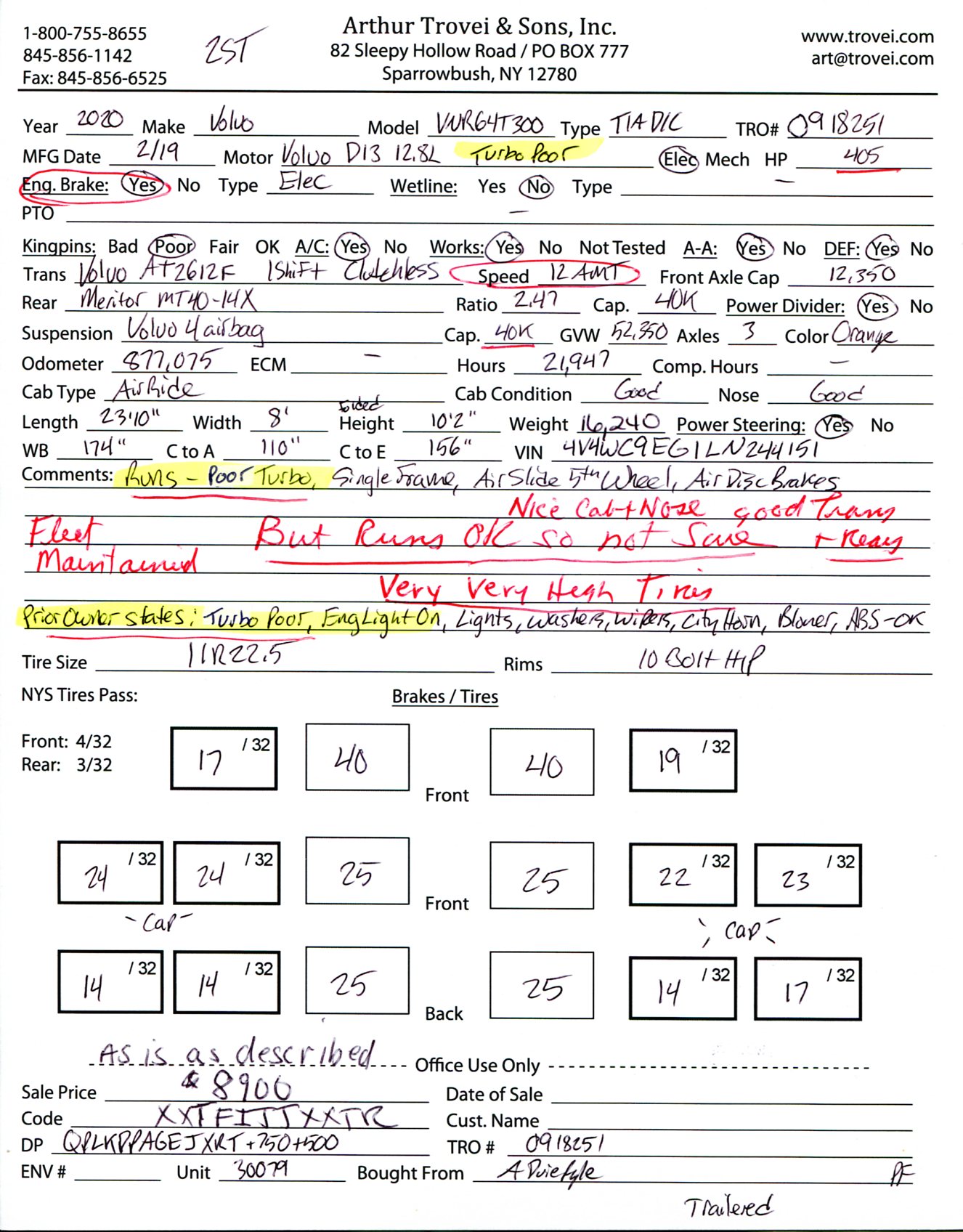 ![]() ![]() ![]() ![]() ![]() ![]() ![]() ![]() ![]() ![]() ![]() ![]() 2020 Volvo VNR64T300 Tandem Axle Day Cab Tractor![]() Year: 2020 Make: Volvo Model: VNR64T300 Type: Tandem Axle Day Cab Tractor VIN: 4V4WC9EG1LN244151 Motor: Volvo D13 12.8L Elec 405 hp - Turbo Poor - Engine Light On Air to Air: Yes Air Conditioning Yes (Works) Engine Brake: Electronic DEF: Yes Transmission: Volvo AT2612F IShift (Clutchless) 12 Speed Automated Manual PTO: n/a Front Axle: 12,350 LB Rear: Meritor MT40-14X 40,000 LB Ratio: 2.47 Power Divider: Yes Suspension: Volvo 4 Air Bag 40,000 LB Tires: 11R22.5 Rims: 10 Bolt Hub Pilot - Steel Odometer Reading: 877,075 ECM Reading: Hour Meter Reading: 21,947 ECM Hour Reading: Length: 23'10" Width: 8' Height w/ fairing folded: 10'2" Wheelbase: 174" Cab to Axle: 110" Cab to End: 156" Weight: 16,240 lbs GVW: 52,350 lbs Added Details: Runs - Turbo Poor - Engine Light On, Single Frame, Air Slide 5th Wheel, Air Disc Brakes Price: $8,900 as is as described 2STXXTFIJJXXTRQPLKDPAGEJXRT+750+500 Terms of Sale