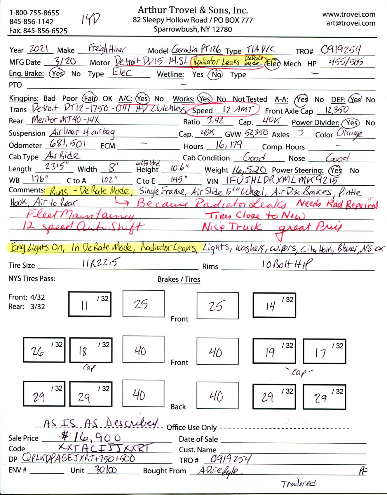 ![]() ![]() ![]() ![]() ![]() ![]() ![]() ![]() ![]() ![]() ![]() ![]() ![]() ![]() ![]() 2021 Freightliner Cascadia PT126 Tandem Axle Day Cab Tractor![]() Year: 2021 Make: Freightliner Model: Cascadia PT126 Type: Tandem Axle Day Cab Tractor VIN: 1FUJHLDRXMLMK9215 Motor: Detroit DD15 14.8L Elec 455/505 HP - Radiator Leaks - DeRate Mode Air to Air: Yes Air Conditioning: Yes (Works) Engine Brake: Electronic DEF: Yes Transmission: Detroit DT12-1750-OH1 HD 12 Speed Automated Manual (Clutchless) PTO: No Front Axle: 12,000 lb Rear: Meritor MT40-14X 40,000 lb Ratio: 3.42 Power Divider: Yes Suspension: Airliner 4 Air Bag 40,000 lb Tires: 11R22.5 Rims: 10 Bolt Hub Pilot - Steel Odometer Reading: 681,501 ECM: Hour Meter Reading: 16,179 ECM Hour Reading: Length: 23'5" Width: 8' Height: 10'6" Wheelbase: 176" Cab to Axle: 102" Cab to End: 145" Weight: 16,520 lb GVW: 52,350 lb Added Features: Runs - DeRate Mode, Radiator Leaks, Single Frame, Air Slide 5th Wheel, Air Disc Brakes, Pintle Hook, Air To Rear Price: $16,900 as is as described 1YDXXTACIJJXXRTQPLKDPAGEJXRT+750+500 Terms of Sale