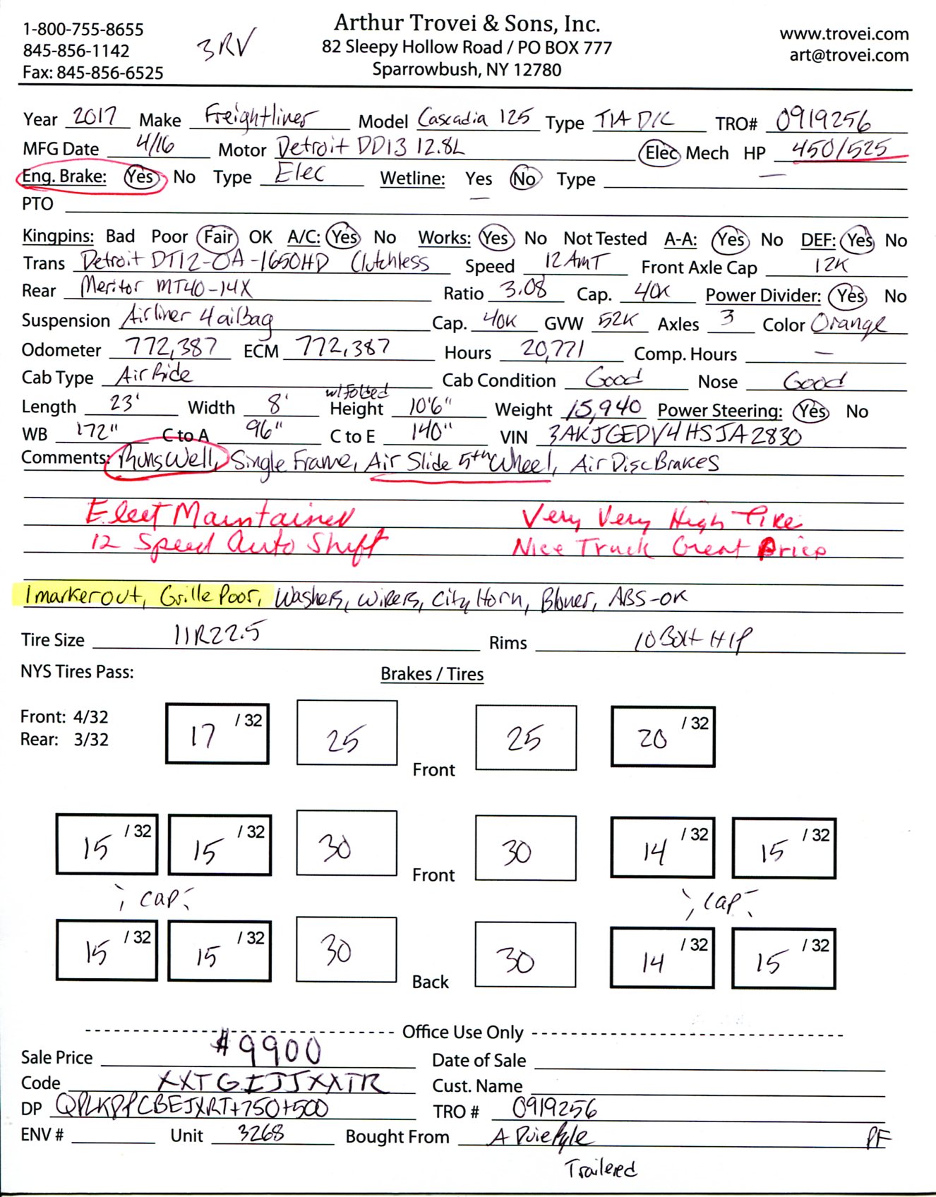 ![]() ![]() ![]() ![]() ![]() ![]() ![]() ![]() ![]() ![]() ![]() ![]() ![]() ![]() 2017 Freightliner Cascadia 125 Tandem Axle Day Cab Tractor![]() Year: 2017 Make: Freightliner Model: Cascadia 125 Type: Tandem Axle Day Cab Tractor VIN: 3AKJGEDV4HSJA2830 Motor: Detroit DD13 12.8L Elec 450/525 HP Air to Air: Yes Air Conditioning: Yes (Works) Engine Brake: Electronic DEF: Yes Transmission: Detroit DT12-OA-1650HD 12 Speed Automated Manual (Clutchless) PTO: No Front Axle: 12,000 lb Rear: Meritor MT40-14X 40,000 lb Ratio: 3.08 Power Divider: Yes Suspension: Airliner 4 Air Bag 40,000 lb Tires: 11R22.5 Rims: 10 Bolt Hub Pilot - Steel Odometer Reading: 772,387 ECM: 772,387 Hour Meter Reading: ECM Hour Reading: 20,771 Length: 23' Width: 8' Height w/ Fairing Down: 10'6" Wheelbase: 172" Cab to Axle: 96" Cab to End: 140" Weight: 15,940 lb GVW: 52,000 lb Added Features: Runs Well, Single Frame, Air Slide 5th Wheel, Air Disc Brakes Price: $9,900 3RVXXTGIJJXXTRQRPLKDPCBEJXRT+750+500 Terms of Sale