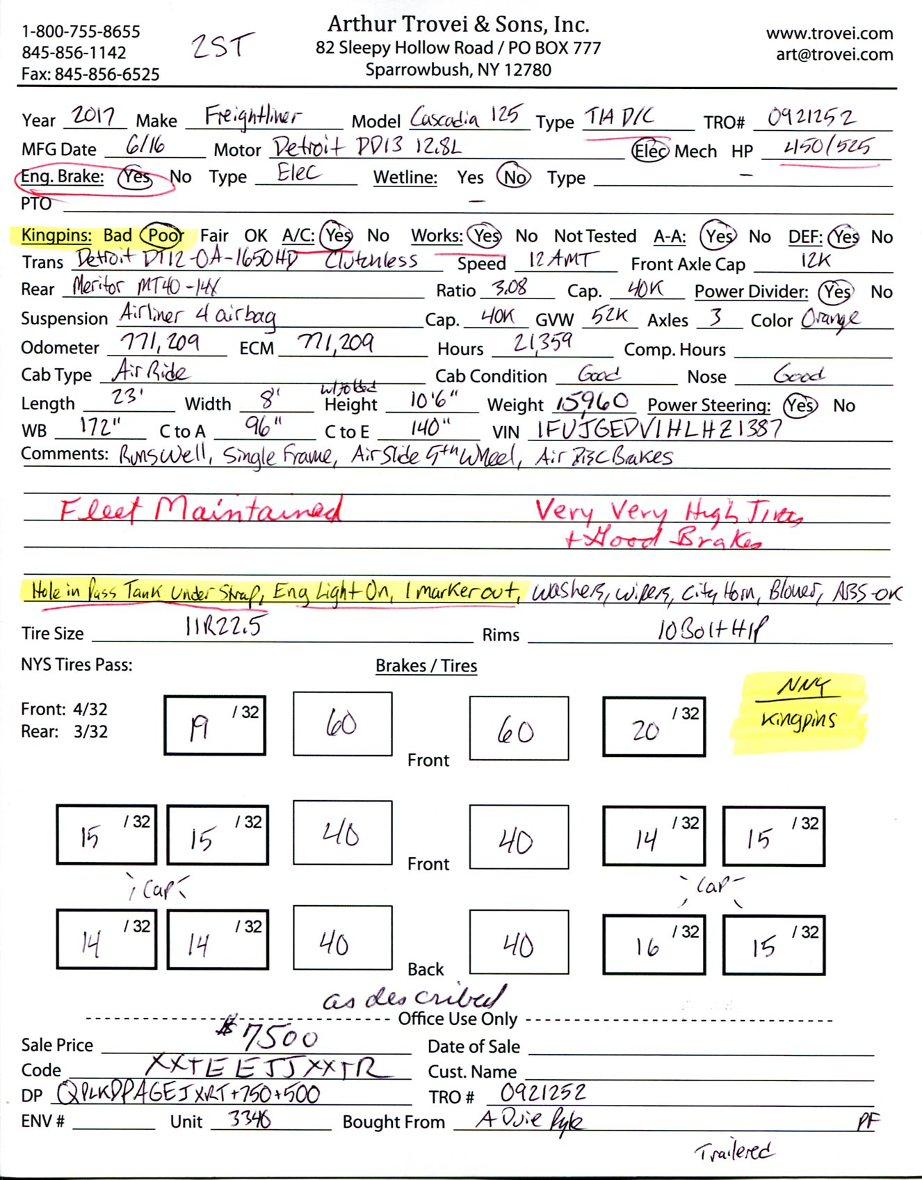 ![]() ![]() ![]() ![]() ![]() ![]() ![]() ![]() ![]() ![]() ![]() ![]() ![]() ![]() 2017 Freightliner Cascadia 125 Tandem Axle Day Cab Tractor![]() Year: 2017 Make: Freightliner Model: Cascadia 125 Type: Tandem Axle Day Cab Tractor VIN: 1FUJGEDV1HLHZ1387 Motor: Detroit DD13 12.8L Elec 450/525 HP - Engine Light On Air to Air: Yes Air Conditioning: Yes (Work) Engine Brake: Electronic DEF: Yes Transmission: Detroit DT12-OA-1650HD 12 Speed Automated Manual (Clutchless) PTO: No Front Axle: 12,000 lb Rear: Meritor MT40-14X 40,000 lb Ratio: 3.08 Power Divider: Yes Suspension: Airliner 4 Air Bag 40,000 lb Tires: 11R22.5 Rims: 10 Bolt Hub Pilot - Steel Odometer Reading: 771,209 ECM: 771,209 Hour Meter Reading: 21,359 ECM Hour Reading: Length: 23' Width: 8' Height w/ Fairing Down: 10'6" Wheelbase: 172" Cab to Axle: 96" Cab to End: 140" Weight: 15,960 lb GVW: 52,000 lb Added Features: Runs Well - Engine Light On, Hole In Pass Fuel Tank, Single Frame, Air Slide 5th Wheel, Air Disc Brakes Price: $7,500 as is as described NNY 2STXXTEEJJXXTRQPLKDPAGEJXRT+750+500 Terms of Sale