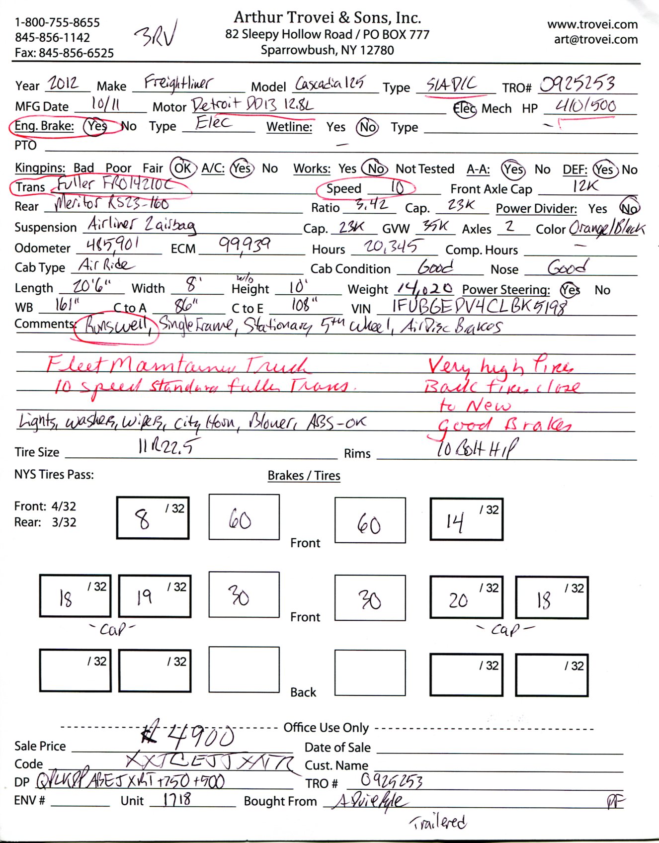 ![]() ![]() ![]() ![]() ![]() ![]() ![]() ![]() ![]() ![]() ![]() ![]() 2012 Freightliner Cascadia 125 Single Axle Day Cab Tractor![]() Year: 2012 Make: Freightliner Model: Cascadia 125 Type: Single Axle Day Cab Tractor VIN: 1FUBGEDV4CLBK5198 Motor: Detroit DD13 12.8L Elec 410/500 HP Air to Air: Yes Air Conditioning: Yes (Not Working) Engine Brake: Electronic DEF: Yes Transmission: Fuller FRO14210C 10 Speed PTO: No Front Axle: 12,000 lb Rear: Meritor RS23-160 23,000 lb Ratio: 3.42 Power Divider: No Suspension: Airliner 2 Air Bag 23,000 lb Tires: 11R22.5 Rims: 10 Bolt Hub Pilot - Steel Odometer Reading: 485,901 ECM: 99,939 Hour Meter Reading: 20,345 ECM Hour Reading: Length: 20'6" Width: 8' Height: 10' Wheelbase: 161" Cab to Axle: 86" Cab to End: 108" Weight: 14,020 lb GVW: 35,000 lb Added Features: Runs Well, Single Frame, Stationary 5th Wheel, Air Disc Brakes Price: $4,900 3RVXXTCEJJXXTRQPLKDPABEJXRT+750+500 Terms of Sale