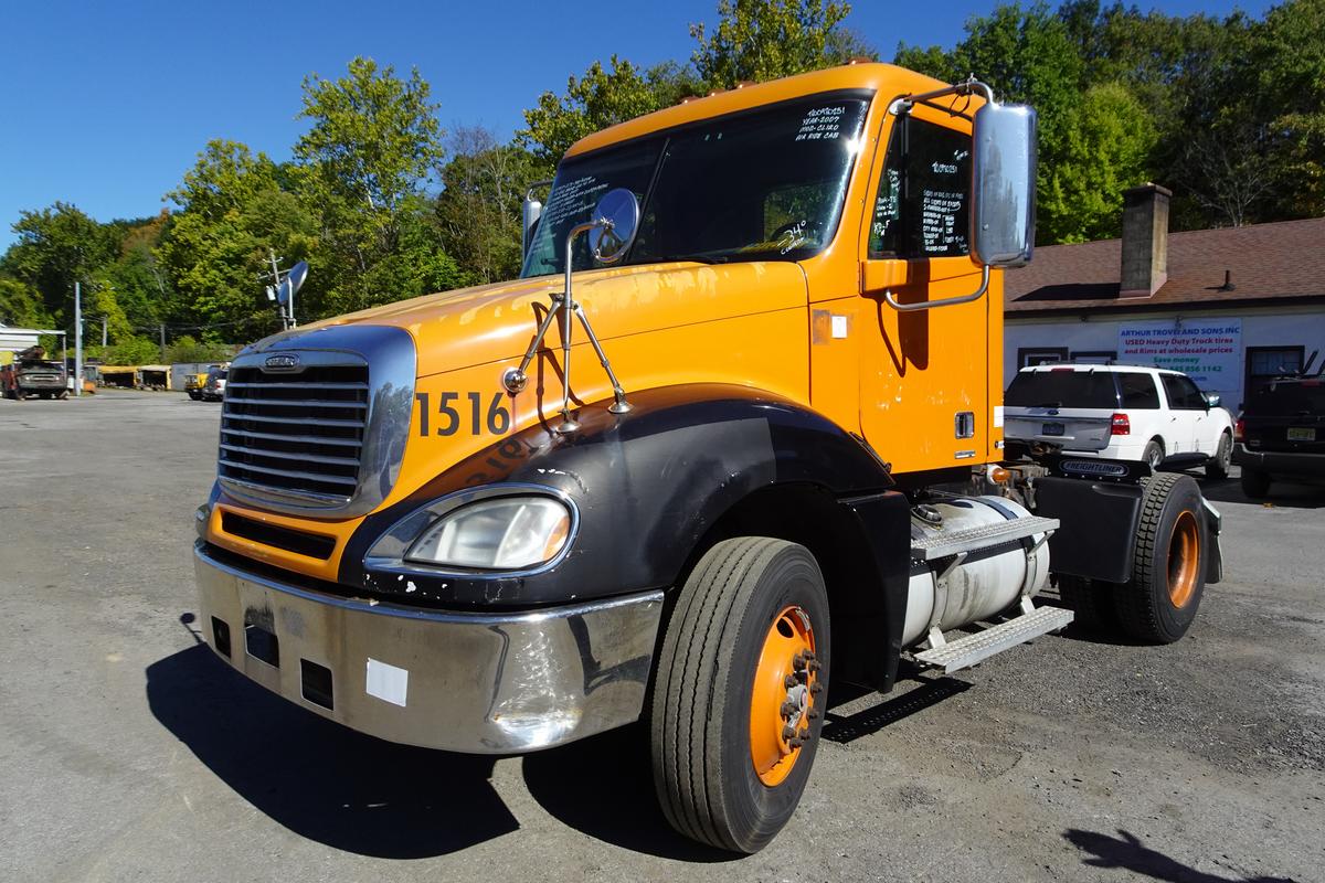 Inventory # 0930251Year: 2007 Make: Freightliner Model: Columbia 120 Type: Single Axle Day Cab Tractor VIN: 1FUBA6CG77LW69904 Motor: Detroit Series 60 12.7L Elec 380/455 HP - Signs Of Oil In Fuel Air to Air: Yes Air Conditioning: Yes (Works) Engine Brake: Electronic DEF: No Transmission: Fuller RTO14910C-AS 10 Speed Automated Manual Transmission With Clutch PTO: No Front Axle: 12,000 lb Rear: Meritor RS23-160 23,000 lb Ratio: 3.58 Power Divider: N/A Suspension: Airliner 2 Air Bag 23,000 lb Tires: 11R22.5 Rims: 10 Bolt Hub Pilot - Steel Odometer Reading: 657,593 ECM: 658,093 Hour Meter Reading: 26,055 ECM Hour Reading: Length: 19'10" Width: 8' Height: 9'9" Wheelbase: 154" Cab to Axle: 80" Cab to End: 103" Weight: 13,640 lbs GVW: 35,000 lb Added Features: Runs Well, Single Frame, Stationary 5th Wheel Price: Sold 2STXXTCIJJXXTQPLKDPAGEJXRT+750+500 Terms of Sale