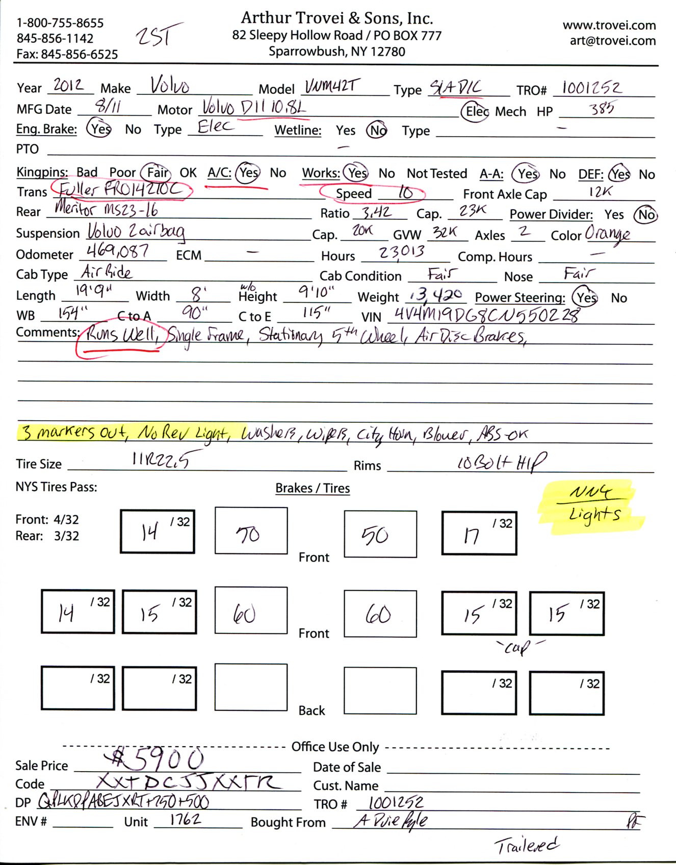![]() ![]() ![]() ![]() ![]() ![]() ![]() ![]() ![]() ![]() ![]() 2012 Volvo VNM42T Single Axle Day Cab Tractor![]() Year: 2012 Make: Volvo Model: VNM42T Type: Single Axle Day Cab Tractor VIN: 4V4M19DG8CN550228 Motor: Volvo D11 10.8L Elec 385 HP Air to Air: Yes Air Conditioning: Yes (Works) Engine Brake: Electronic DEF: Yes Transmission: Fuller FRO14210C 10 Speed PTO: No Front Axle: 12,000 lb Rear: Meritor MS23-16 23,000 lb Ratio: 3.42 Power Divider: No Suspension: Volvo 2 Air Bag 20,000 lb Tires: 11R22.5 Rims: 10 Bolt Hub Pilot - steel Odometer Reading: 469,087 ECM: Hour Meter Reading: 23,013 ECM Hour Reading: Length: 19'9" Width: 8' Height w/ Fairing: 12' Wheelbase: 154" Cab to Axle: 90" Cab to End: 115" Weight: 13,420 lb GVW: 32,000 lb Added Features: Runs Well, Single Frame, Stationary 5th Wheel, Air Disc Brakes Price: $5,900 NNY 2STXXTDCJJXXTRQPLKDPABEJXRT+750+500 Terms of Sale