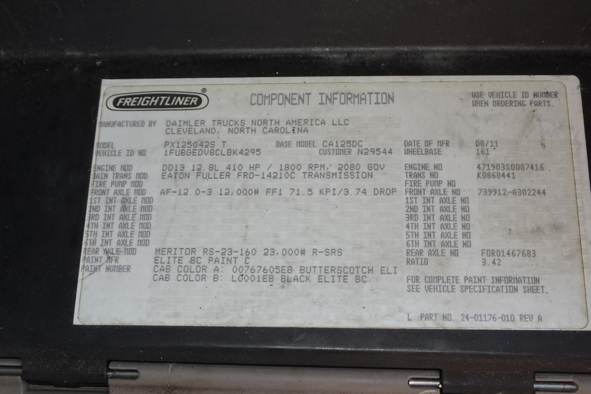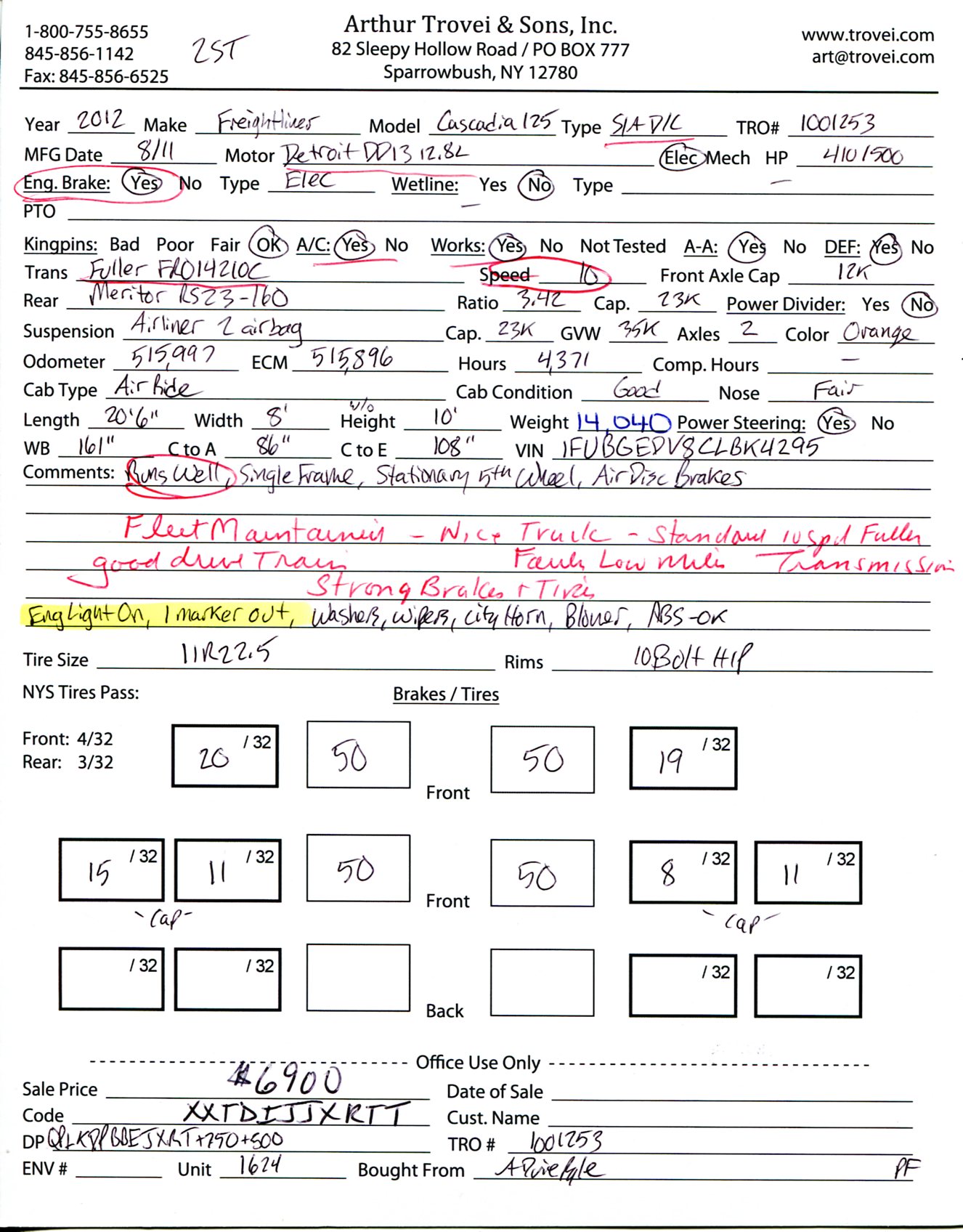Inventory # 1001253Year: 2012 Make: Freightliner Model: Cascadia 125 Type: Single Axle Day Cab Tractor VIN: 1FUBGEDV8CLBK4295 Motor: Detroit DD13 12.8L Elec 410/500 HP Air to Air: Yes Air Conditioning: Yes (Works) Engine Brake: Electronic DEF: Yes Transmission: Fuller FRO14210C 10 Speed PTO: No Front Axle: 12,000 lb Rear: Meritor RS23-160 23,000 lb Ratio: 3.42 Power Divider: No Suspension: Airliner 2 Air Bag 23,000 lb Tires: 11R22.5 Rims: 10 Bolt Hub Pilot - Steel Odometer Reading: 515,997 ECM: 515,896 Hour Meter Reading: 4,371* ECM Hour Reading: Length: 20'6" Width: 8' Height: 10' Wheelbase: 161" Cab to Axle: 86" Cab to End: 108" Weight: 14,040 lb GVW: 35,000 lb Added Features: Runs Well, Single Frame, Stationary 5th Wheel, Air Disc Brakes Price: $6,900 2STXXTDIJJXXTRQPLKDPBBEJXRT+750+500 Terms of Sale