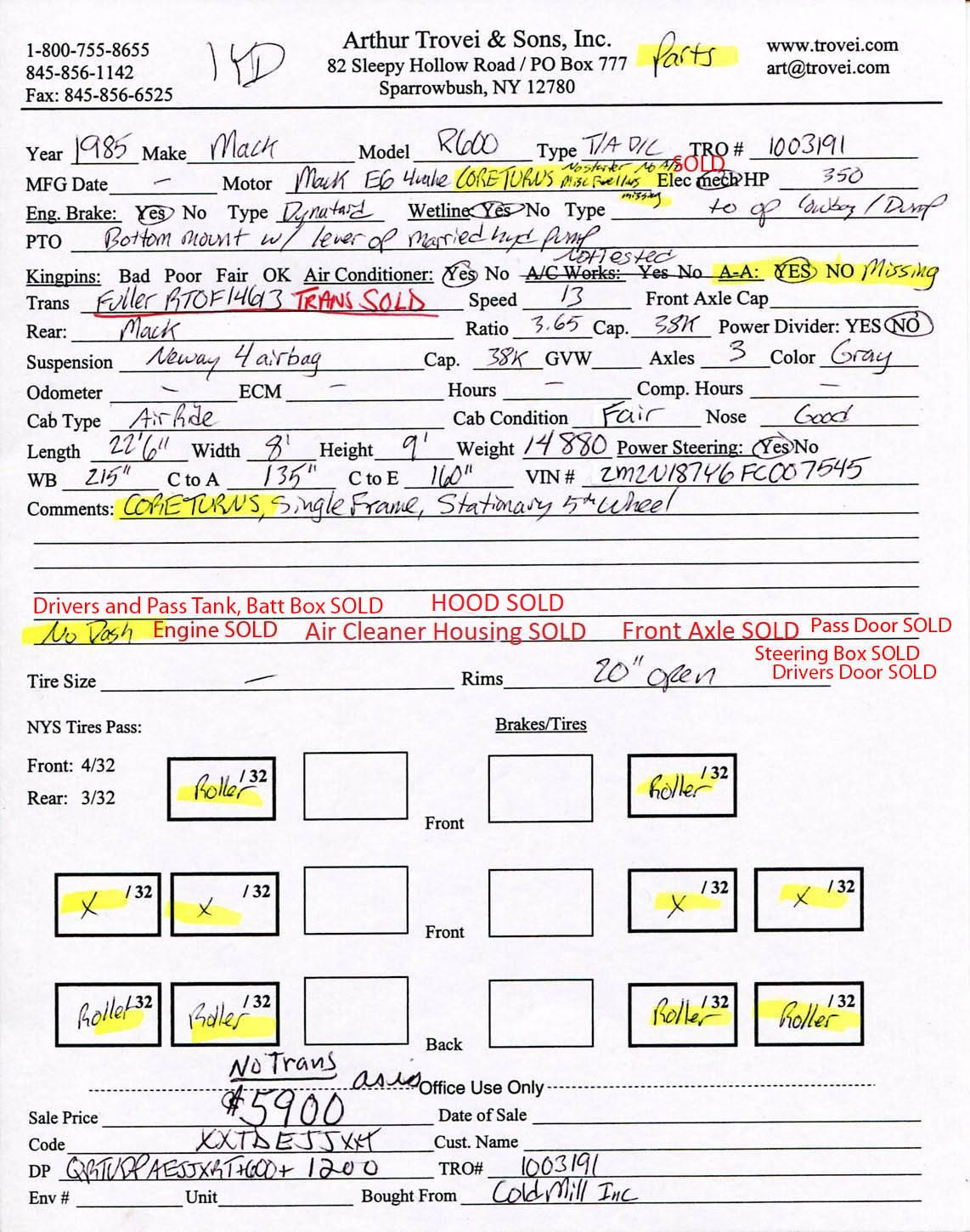 Added Details: single frame - stationary 5th wheel - hood / engine / transmission / front axle / air cleaner housing / steering box / doors / fuel tanks / batt box ALL SOLD