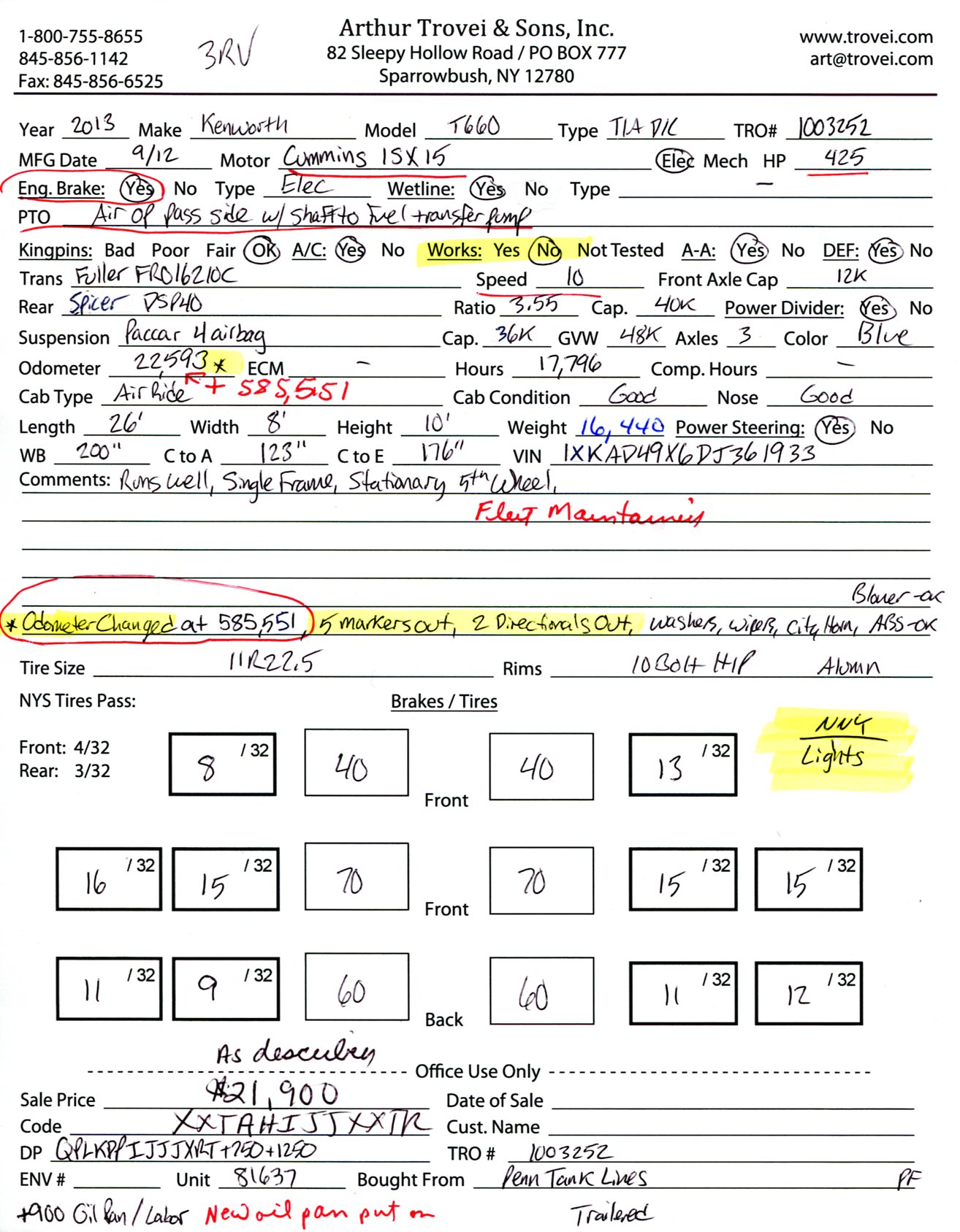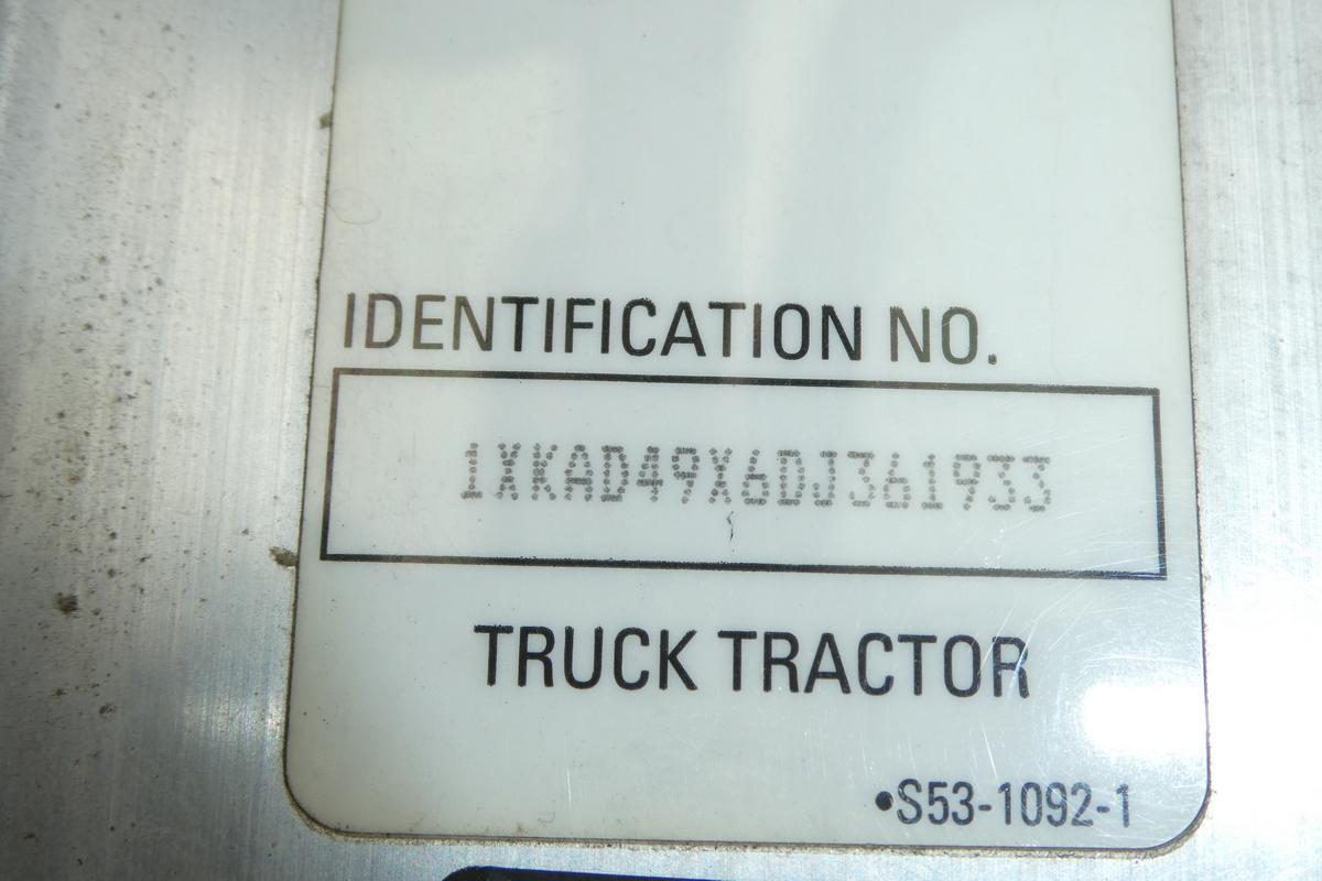 Inventory # 1003252Year: 2013 Make: Kenworth Model: T660 Type: Tandem Axle Day Cab Tractor VIN: 1XKAD49X6DJ361933 Motor: Cummins ISX 15.0L Elec 425 HP (New Oil Pan) Air to Air: Yes Air Conditioning: Yes (Not Working) Engine Brake: Electronic DEF: Yes Transmission: Fuller FRO16210C 10 Speed PTO: Air Operated Passenger Side With Shaft To Fuel Transfer Pump Front Axle: 12,000 lb Rear: Spicer DSP40 40,000 lb Ratio: 3.55 Power Divider: Yes Suspension: Paccar 4 air bag 36,000 lb Tires: 11R22.5 Rims: 10 Bolt Hub Pilot - Aluminum Odometer Reading: 22,593 (Odometer Changed At 585,551. 608,144 Total) ECM: Hour Meter Reading: 17,796 ECM Hour Reading: Length: 26' Width: 8' Height: 10' Wheelbase: 200" Cab to Axle: 123" Cab to End: 176" Weight: 16,440 lb GVW: 48,000 lb Added Features: Runs Well, Single Frame, Stationary 5th Wheel Price: $21,900 as described NNY 3RVXXTAHIJJXXTRTQPLKDPIJJJXRT+750+1250+900 Terms of Sale