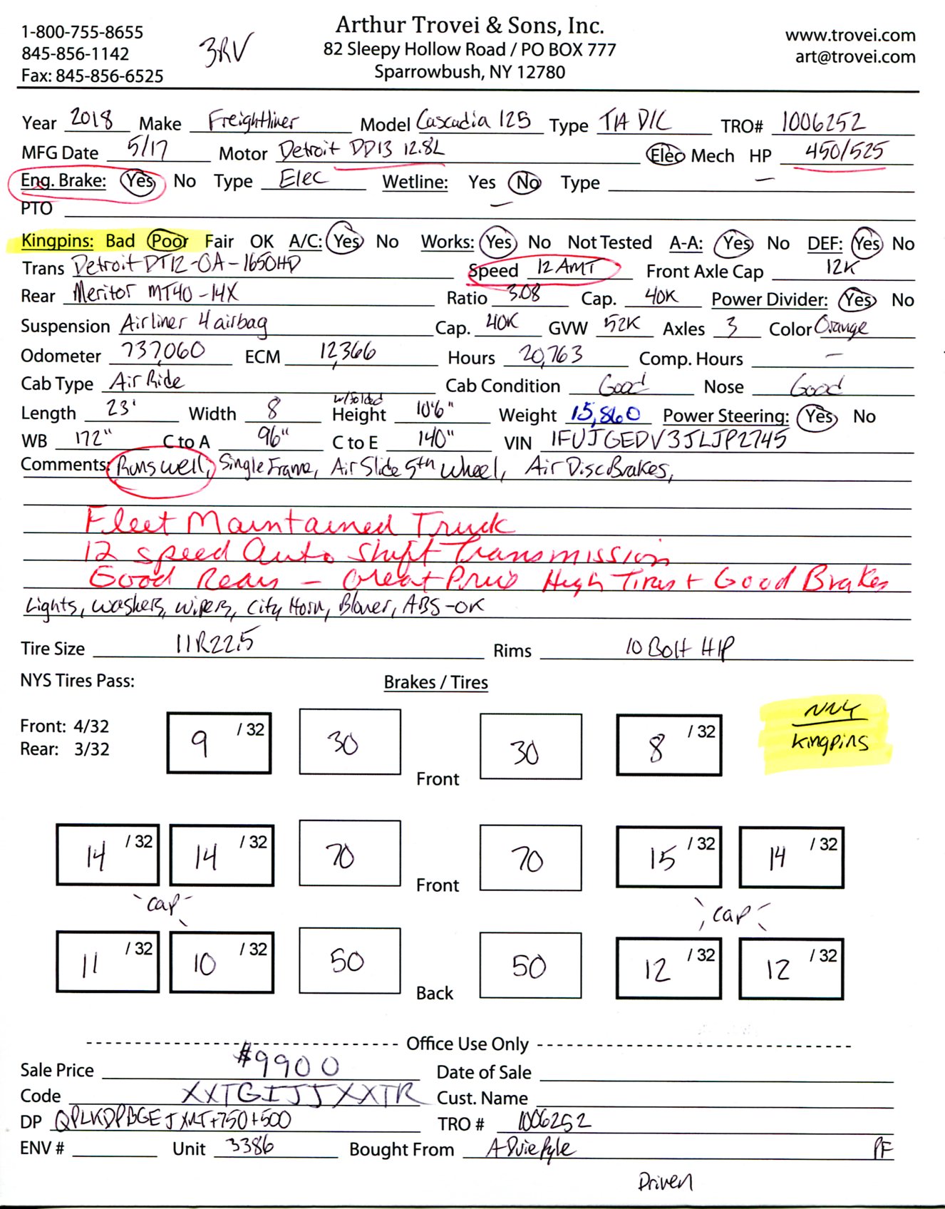 Inventory # 1006252Year: 2018 Make: Freightliner Model: Cascadia 125 Type: Tandem Axle Day Cab Tractor VIN: 1FUJGEDV3JLJP2745 Motor: Detroit DD13 12.8L Elec 450/500 HP Air to Air: Yes Air Conditioning: Yes (Works) Engine Brake: Electronic DEF: Yes Transmission: Detroit DT12-OA-1650HD 12 Speed Automated Manual (Clutchless) PTO: No Front Axle: 12,000 lb Rear: Meritor MT40-14X 40,000 lb Ratio: 3.08 Power Divider: Yes Suspension: Airliner 4 Air Bag 40,000 lb Tires: 11R22.5 Rims: 10 Bolt Hub Pilot - Steel Odometer Reading: 737,060 ECM: 12,366 Hour Meter Reading: 20,763 ECM Hour Reading: Length: 23' Width: 8' Height w/ Fairing Down: 10'6" Wheelbase: 172" Cab to Axle: 96" Cab to End: 140" Weight: 15,860 lb GVW: 52,000 lb Added Features: Runs Well, Single Frame, Air Slide 5th Wheel, Air Disc Brakes Price: $9,900 NNY 3RVXXTGIJJXXTRQPLKDPBGEJXRT+750+500 Terms of Sale