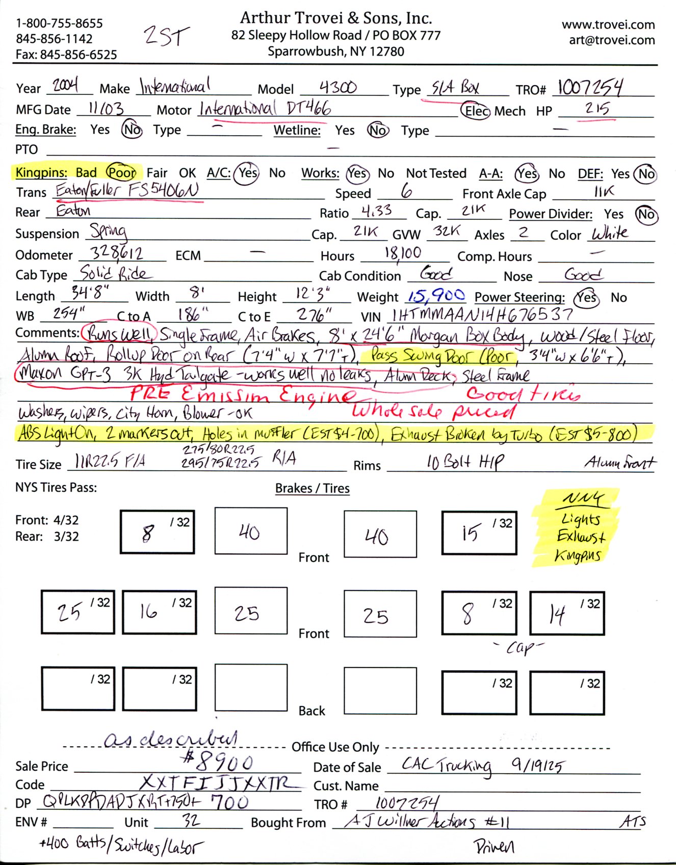 ![]() ![]() ![]() ![]() ![]() ![]() ![]() ![]() ![]() ![]() ![]() ![]() ![]() ![]() ![]() ![]() ![]() ![]() ![]() ![]() ![]() ![]() ![]() ![]() 2004 International 4300 Single Axle Box Truck![]() Year: 2004 Make: International Model: 4300 Type: Single Axle Box Truck VIN: 1HTMMAAN14H676537 Motor: International DT466 Elec 215 HP Engine Brake: No DEF: No Air to Air: Yes Air Conditioning: Yes (Works) Transmission: Eaton Fuller FS5406N 6 Speed PTO: No Front Axle: 11,000 lb Rear: Eaton 21,000 lb Ratio: 4.33 Suspension: Spring 21,000 lb Tires: 11R22.5 F/A - 275/80R22.5 / 295/75R22.5 R/A Rims: 10 Bolt Hub Pilot Odometer Reading: 328,612 ECM: Hour Meter Reading: 18,100 Computer Hour Reading: Length: 34'8" Width: 8' Height: 12'3" Wheelbase: 254" Cab to Axle: 186" Cab to End: 276" Weight: 15,900 lb GVW: 32,000 lb Box Details: 8' Wide x 24'6" Long Morgan Box Body, Roll Up Door (7'4" W x 7'7" T, Steel Surround), Pass Side Swing Door (Poor 3'4" W x 6'6" T), Wood/Steel Floor, Aluminum Roof Liftgate Details: Maxon GPT-3, 3,000 lb Capacity, Aluminum Deck, Steel Frame, Works Well, No Leaks Added Details: Runs Well, Single Frame, Air Brakes, Exhaust Needs Repair Price: $8,900 as described NNY 2STXXTFIJJXXTRQPLKDPDADJXRT+750+700+400 Terms of Sale