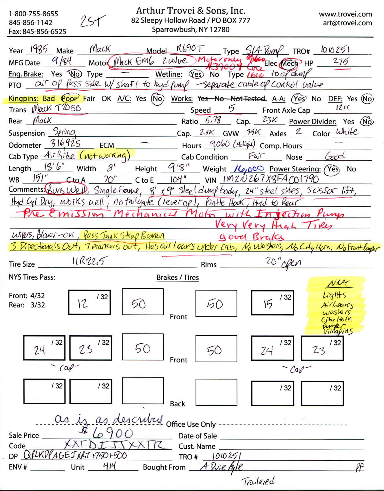 ![]() ![]() ![]() ![]() ![]() ![]() ![]() ![]() ![]() ![]() ![]() ![]() ![]() ![]() ![]() ![]() ![]() ![]() ![]() ![]() ![]() ![]() ![]() ![]() ![]() ![]() ![]() ![]() ![]() ![]() 1985 Mack R690T Single Axle Dump Truck![]() Year: 1985 Make: Mack Model: R690T Type: Single Axle Dump Truck VIN: 1M2N267X8FA001790 Motor: Mack EM6 2 Valve Mech 275 HP Wetline: Hydraulic For Dump / Plow / Sander Air to Air: Yes Engine Brake: No Transmission: Mack T2050 5 Speed PTO: Air Operated Passenger Side With Shaft To Hydraulic Pump - Separate Cable Operated Control Valve Rear: Mack 23,000 lb Ratio: 5.78 Power Divider: No Suspension: Spring 23,000 lb Tires: 11R22.5 Rims: 20" Open Odometer Reading: 316,925 ECM: Hour Meter Reading: 9,060 (4 Digit) Computer Hour Reading: Length: 18'6" Width: 8' Height: 9'8" Wheelbase: 151" Cab to Axle: 70" Cab to End: 104" Weight: 16,000 lb GVW: 35,000 lb Dump Body: 8' x 9' Steel Dump Body, 24" Steel Sides, No Tailgate (Lever Operated), Pintle Hook, Hydraulics To Rear, Scissor Lift - Hydraulic Cylinder Dry - Works Well Added Details: Runs Well, Single Frame, Air Brakes, Passenger Fuel Tank Strap Broken, Air Leaks Under Cab, Air Ride Cab Not Working, No Front Bumper Price: $6,900 as is as described NNY 2STXXTDIJJXXTRQPLKDPAGEJXRT+750+500 Terms of Sale