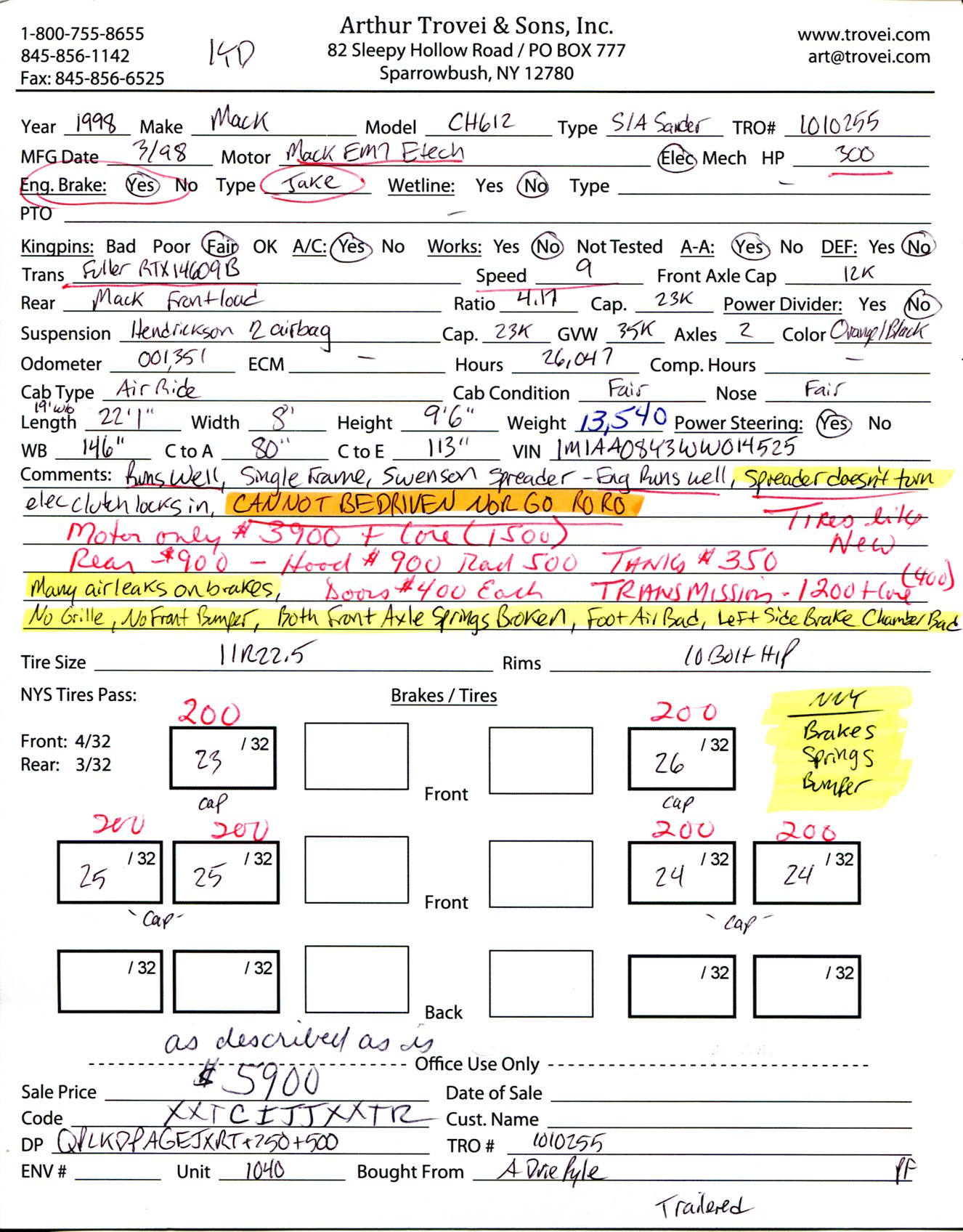 ![]() ![]() ![]() ![]() ![]() ![]() ![]() ![]() ![]() ![]() ![]() ![]() ![]() ![]() ![]() ![]() ![]() ![]() ![]() ![]() ![]() ![]() 1998 Mack CH612 Single Axle Spreader Truck![]() Year: 1998 Make: Mack Model: CH612 Type: Single Axle Spreader Truck VIN: 1M1AA08Y3WW014525 Motor: Mack EM7 Etech Elec 300 HP Wetline: No Air to Air: Yes Engine Brake: No Transmission: Fuller RTX14609B 9 Speed PTO: No Rear: Mack Front Load 23,000 lb Ratio: 4.17 Power Divider: No Suspension: Hendrickson 2 Air Bag 23,000 lb Tires: 11R22.5 Rims: 10 Bolt Hub Pilot Odometer Reading: 001,351 ECM: Hour Meter Reading: 26,047 Computer Hour Reading: Length w/ Spreader: 22'1" Length: 19' Width: 8' Height: 9'6" Wheelbase: 146" Cab to Axle: 80" Cab to End: 113" Weight: 13,540 lb GVW: 35,000 lb Spreader Body: Swenson Spreader, Engine Runs Well, Spreader Doesn't Turn, Elec Clutch Locks In Added Details: Runs Well - CANNOT BE DRIVEN NOR GO RORO (Brakes), Single Frame, Air Brakes, Many Air Leaks On Brakes, No Grille, No Front Bumper, Both Front Axle Springs Broken Price: $5,900 as is as described NNY 1YDXXCIJJXXTRQPLKDPAGEJXRT+750+500 Terms of Sale