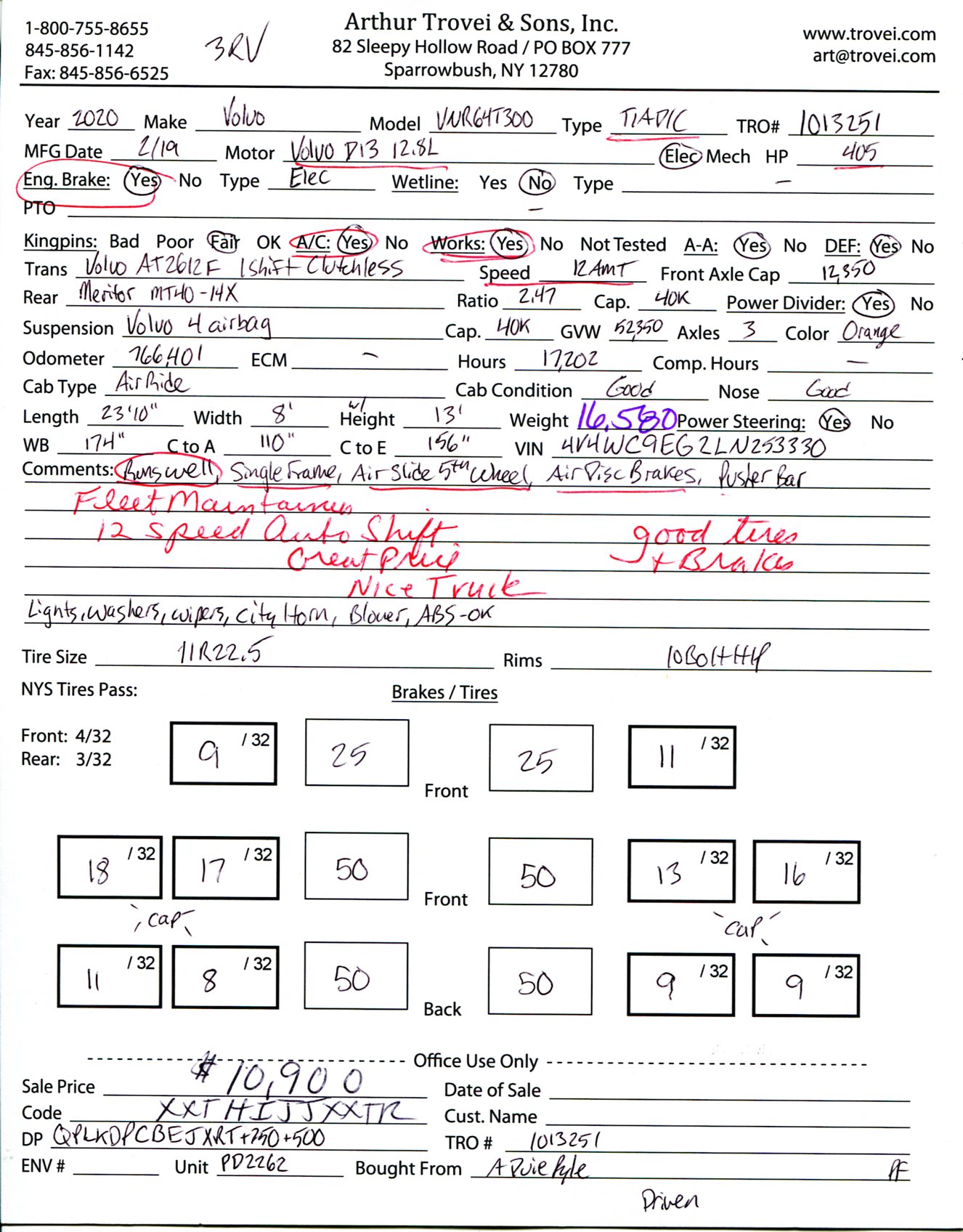 ![]() ![]() ![]() ![]() ![]() ![]() ![]() ![]() ![]() ![]() ![]() ![]() ![]() ![]() 2020 Volvo VNR64T300 Tandem Axle Day Cab Tractor![]() Year: 2020 Make: Volvo Model: VNR64T300 Type: Tandem Axle Day Cab Tractor VIN: 4V4WC9EG2LN253330 Motor: Volvo D13 12.8L Elec 405 hp Air to Air: Yes Air Conditioning Yes (Works) Engine Brake: Electronic DEF: Yes Transmission: Volvo AT2612F IShift (Clutchless) 12 Speed Automated Manual PTO: n/a Front Axle: 12,350 LB Rear: Meritor MT40-14X 40,000 LB Ratio: 2.47 Power Divider: Yes Suspension: Volvo 4 Air Bag 40,000 LB Tires: 11R22.5 Rims: 10 Bolt Hub Pilot - Steel Odometer Reading: 766,401 ECM Reading: Hour Meter Reading: 17,202 ECM Hour Reading: Length: 23'10" Width: 8' Height w/ Fairing: 13' Wheelbase: 174" Cab to Axle: 110" Cab to End: 156" Weight: 16,580 lb GVW: 52,350 lb Added Details: Runs Well, Single Frame, Air Slide 5th Wheel, Air Disc Brakes, Pusher Bar Price: $10,900 3RVXXTHIJJXXTRQPLKDPCBEJXRT+750+500 Terms of Sale