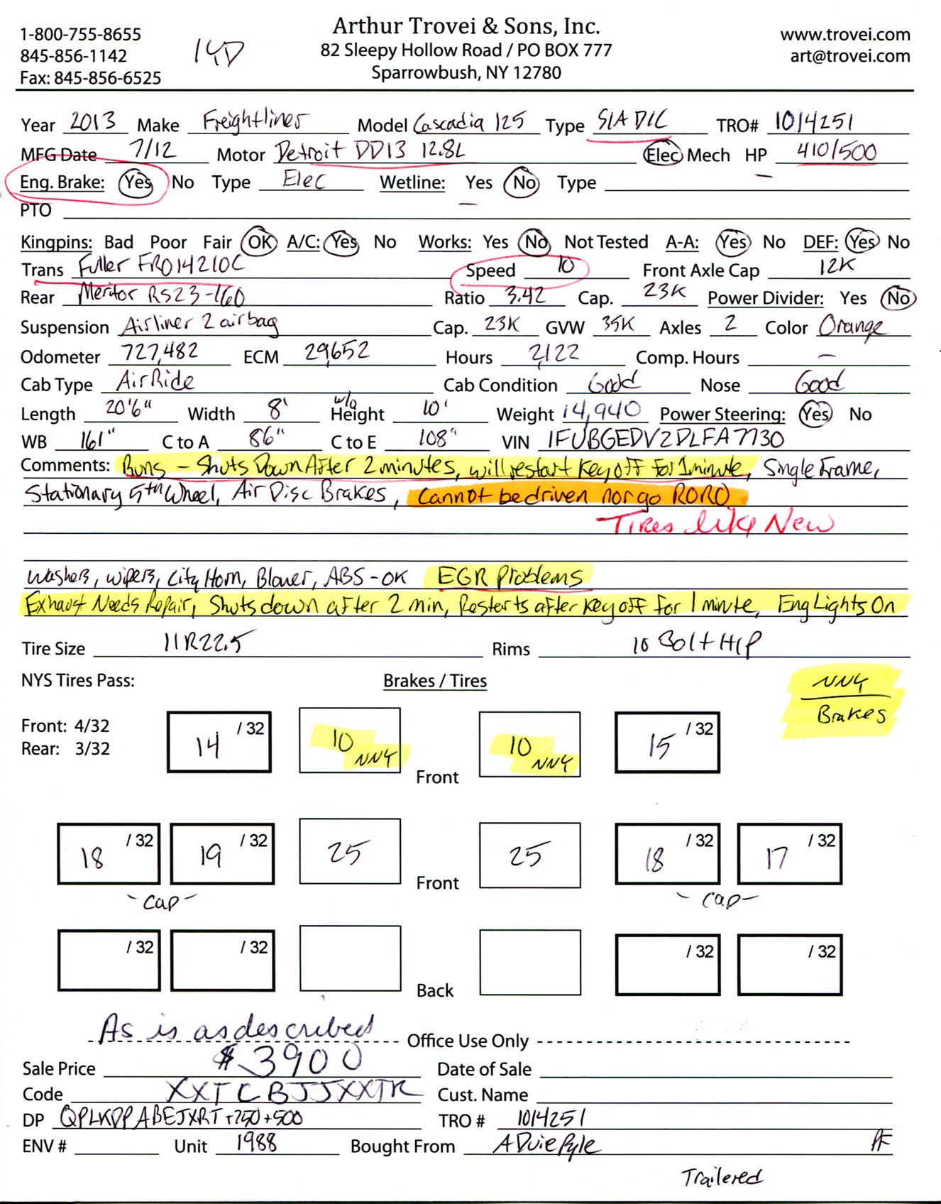 Inventory # 1014251Year: 2013 Make: Freightliner Model: Cascadia 125 Type: Single Axle Day Cab Tractor VIN: 1FUBGEDV2DLFA7730 Motor: Detroit DD13 12.8L Elec 410/500 HP - EGR Problems Air to Air: Yes Air Conditioning: Yes (Not Working) Engine Brake: Electronic DEF: Yes Transmission: Fuller FRO14210C 10 Speed PTO: No Front Axle: 12,000 lb Rear: Meritor RS23-160 23,000 lb Ratio: 3.42 Power Divider: No Suspension: Airliner 2 Air Bag 23,000 lb Tires: 11R22.5 Rims: 10 Bolt Hub Pilot - Steel Odometer Reading: 727,482 ECM: 29,652 Hour Meter Reading: 2,122 ECM Hour Reading: Length: 20'6" Width: 8' Height: 10' Wheelbase: 161" Cab to Axle: 86" Cab to End: 108" Weight: 14,940 lb GVW: 35,000 lb Added Features: Runs - Shuts Down After 2 Minutes, Will Restart Key Off For 1 Minutes, CANNOT BE DRIVEN NOR GO RORO, Single Frame, Stationary 5th Wheel, Air Disc Brakes Price: $3,900 as is as described NNY 1YDXXTCBJJXXTRQPLKDPABEJXRT+750+500 Terms of Sale