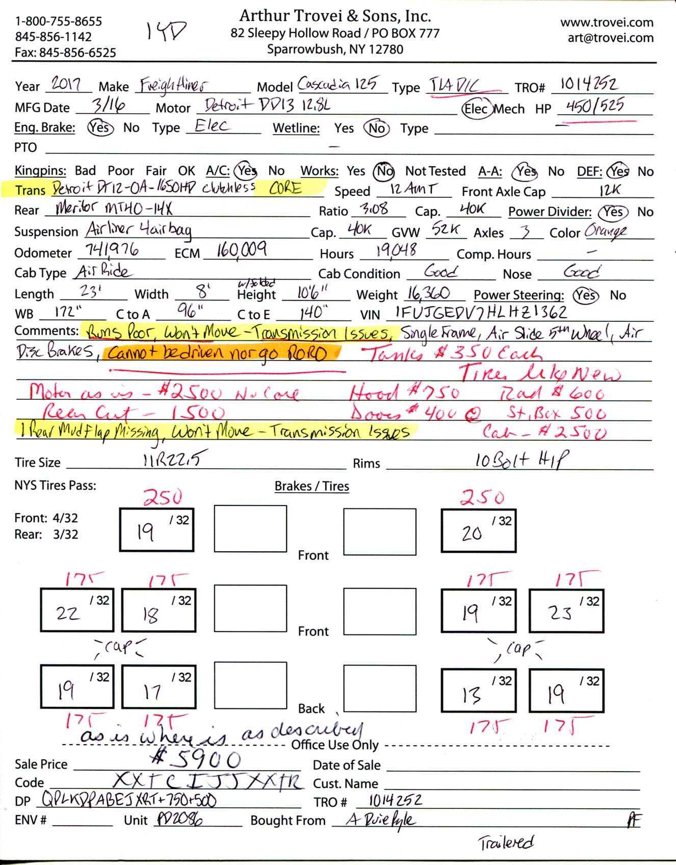 Inventory # 1014252Year: 2017 Make: Freightliner Model: Cascadia 125 Type: Tandem Axle Day Cab Tractor VIN: 1FUJGEDV7HLHZ1362 Motor: Detroit DD13 12.8L elec 450/525 HP Air to Air: Yes Air Conditioning: Yes (Not Working) Engine Brake: Electronic DEF: Yes Transmission: Detroit DT12-OA-1650HD 12 speed automated manual (clutchless) - WON'T MOVE CAN'T BE DRIVEN PTO: No Front Axle: 12,000 lb Rear: Meritor MT40-14X 40,000 lb Ratio: 3.08 Power Divider: Yes Suspension: Airliner 4 Air Bag 40,000 lb Tires: 11R22.5 Rims: 10 bolt hub pilot - steel Odometer Reading: 741,976 ECM: 160,009 Hour Meter Reading: 19,048 ECM Hour Reading: Length: 23' Width: 8' Height w/ Folded: 10'6" Wheelbase: 172" Cab to Axle: 96" Cab to End: 140" Weight: 16,360 lb GVW: 52,000 lb Added Features: Runs Poor - Transmission Problem - WON'T MOVE CAN'T BE DRIVEN CANNOT GO RORO, Single Frame, Air Slide 5th Wheel, Air Disc Brakes Price: $5,900 as is as described NNY 1YDXXTCIJJXXTRQPLKDPABEJXRT+750+500 Terms of Sale